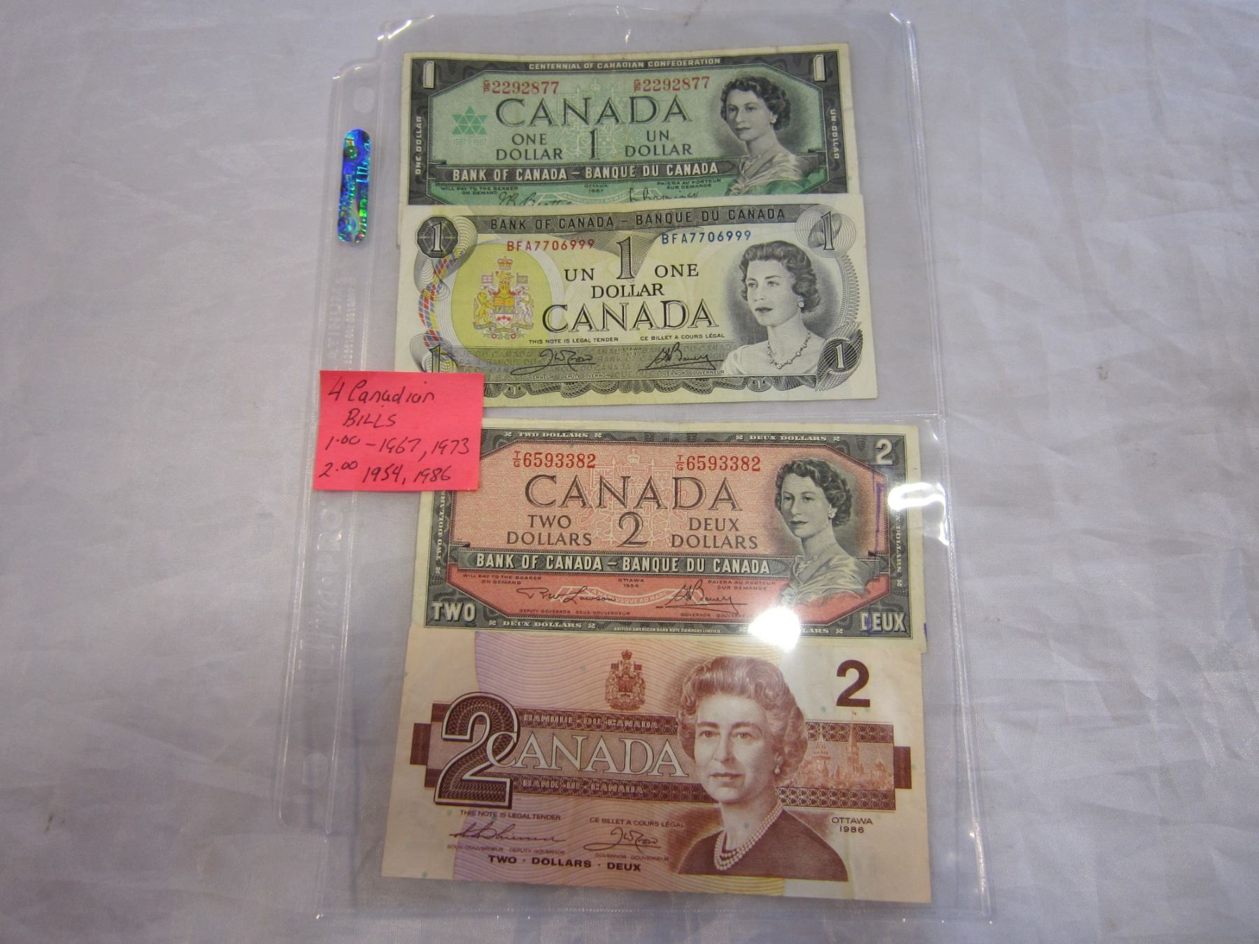 4 CANADIAN BILLS $2 BILLS 1954, 1986 $1 BILLS 1967 WITH SERIAL NUMBERS AND 1973