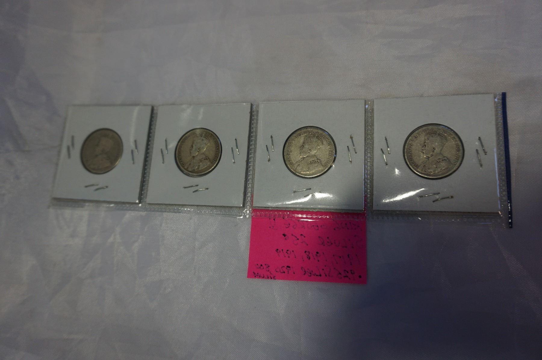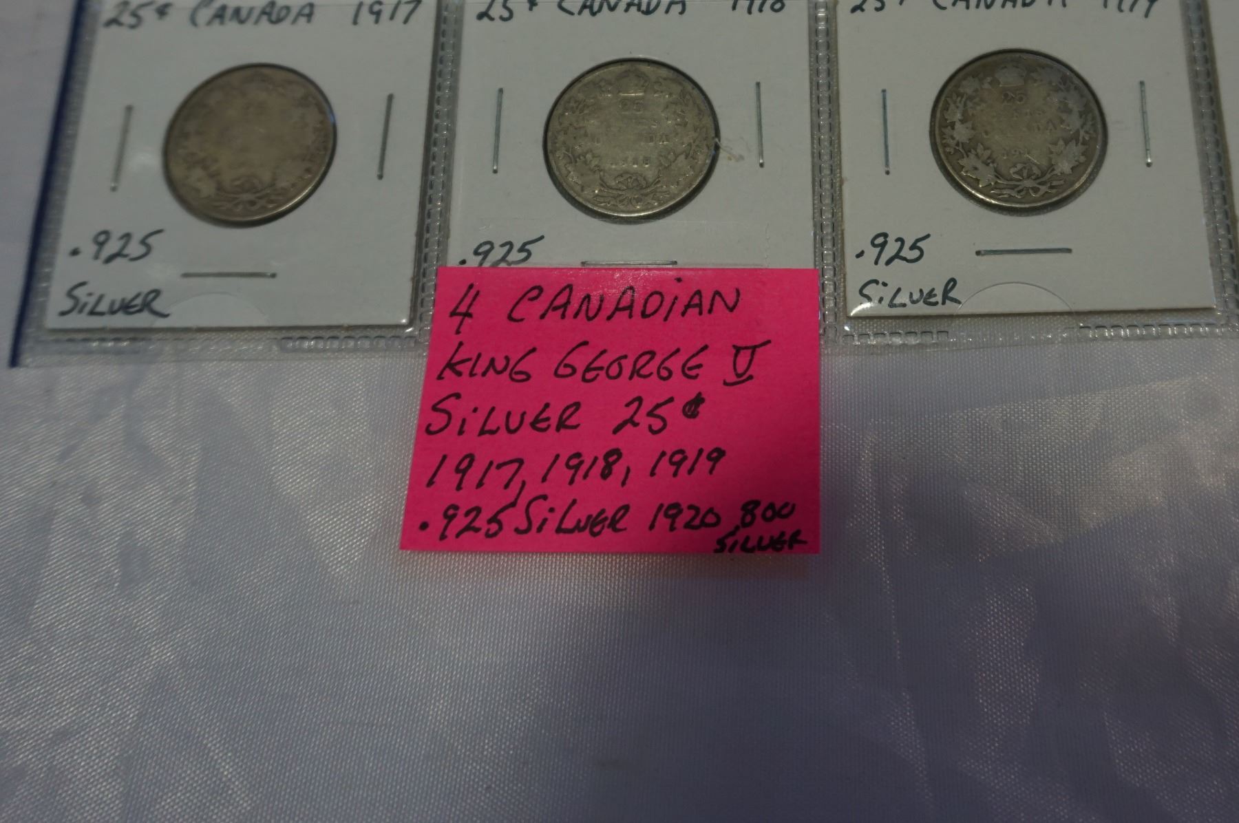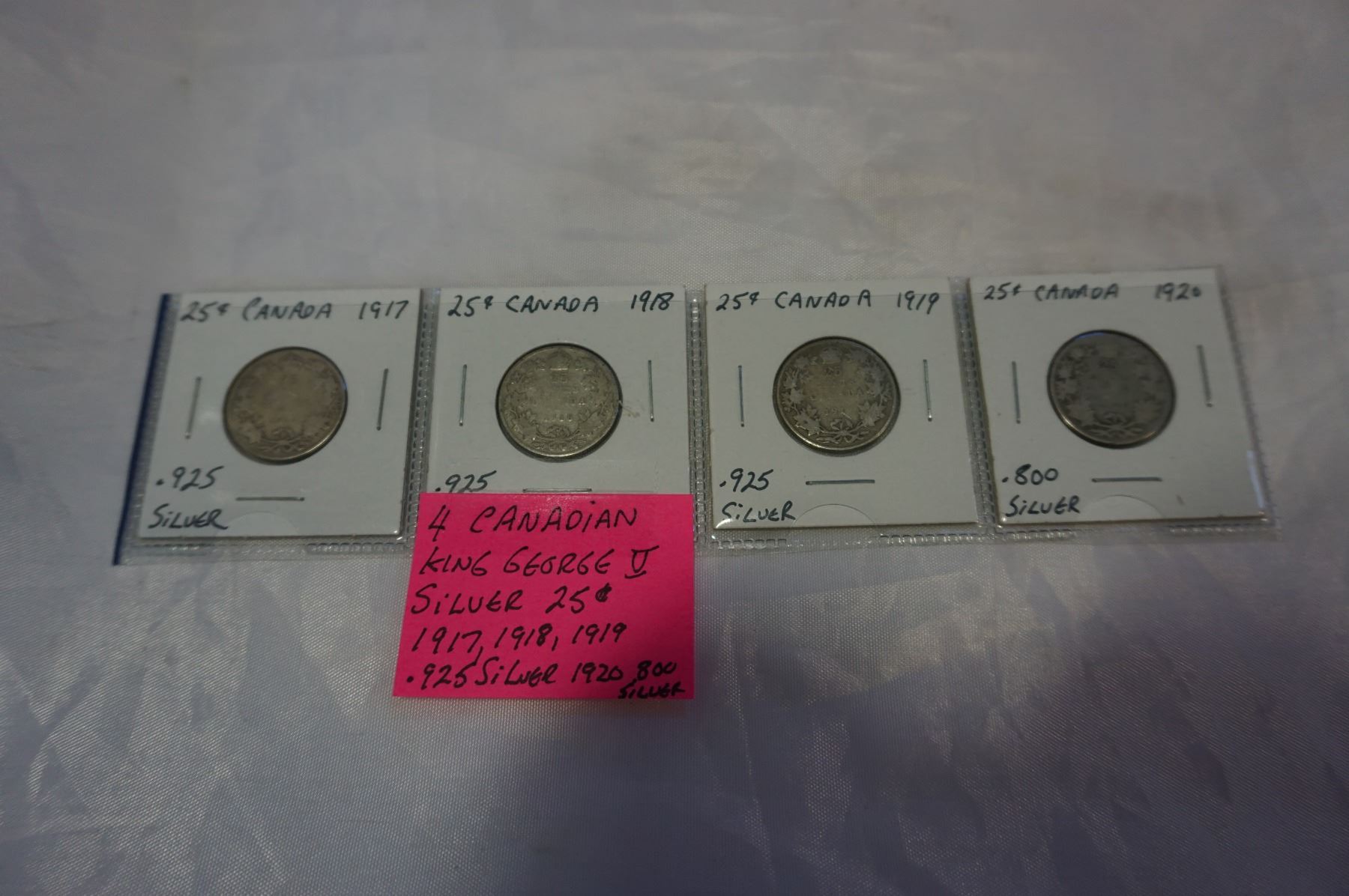 4 CANADIAN KING GEORGE V SILVER 25c 1917,18,19 .925 SILVER AND 1920 .800 SILVER