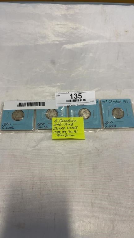 4 CANADIAN WARTIME SILVER DIMES .800 SILVER 1938-1941