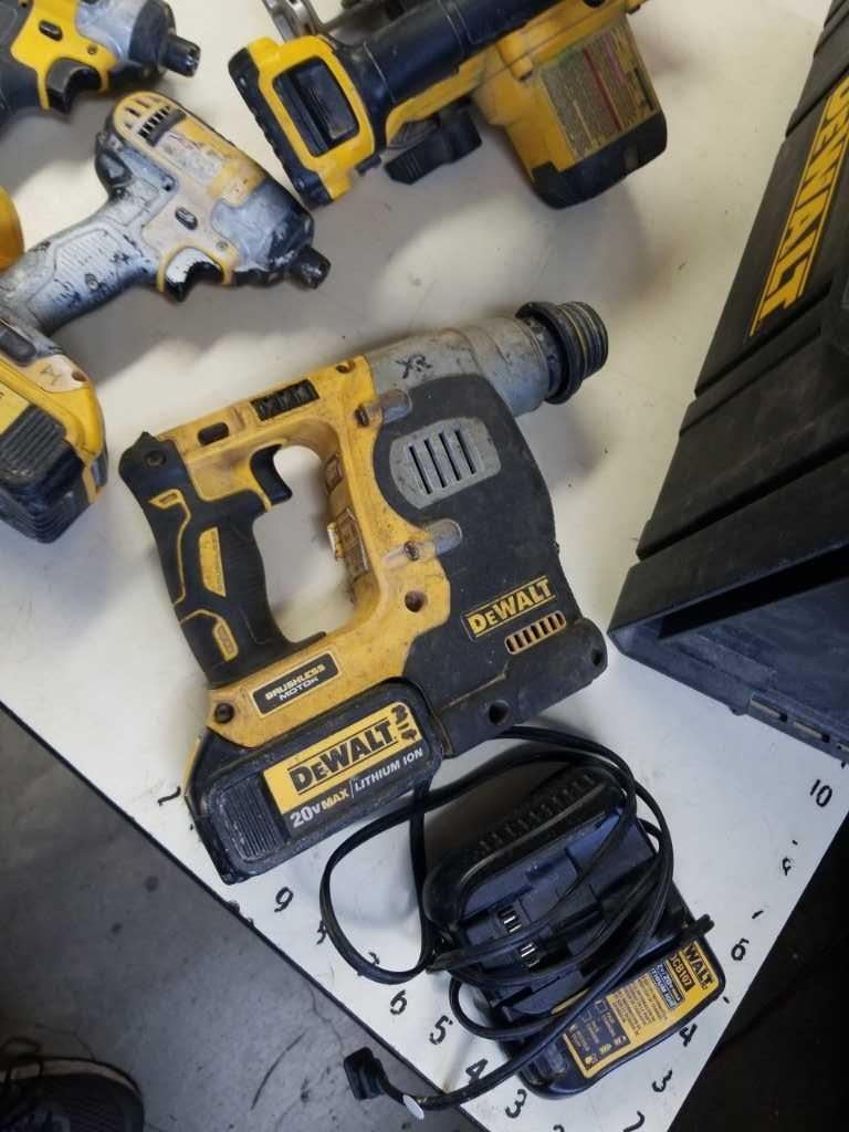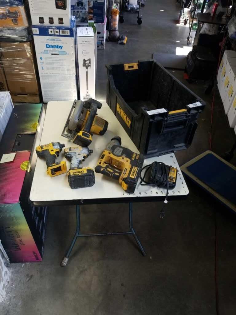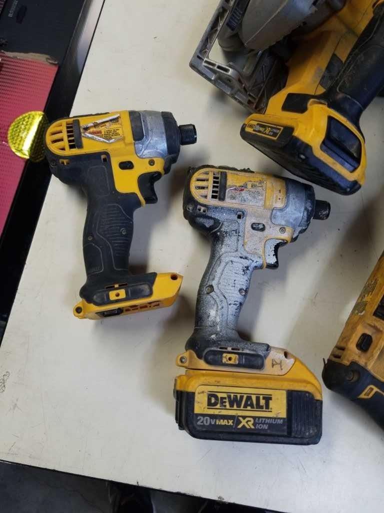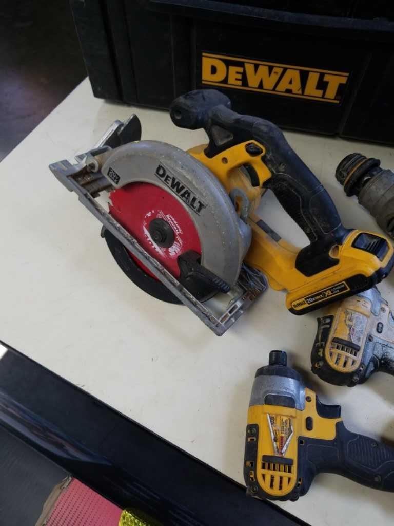 4 DEWALT CORDLESS 20V TOOLS - 6.5" CIRCULAR SAW, SDS BRUSHLESS HAMMER DRILL, 2 IMPACT DRIVERS, 3 BATTERIES AND CHARGER TESTED AND WORKING