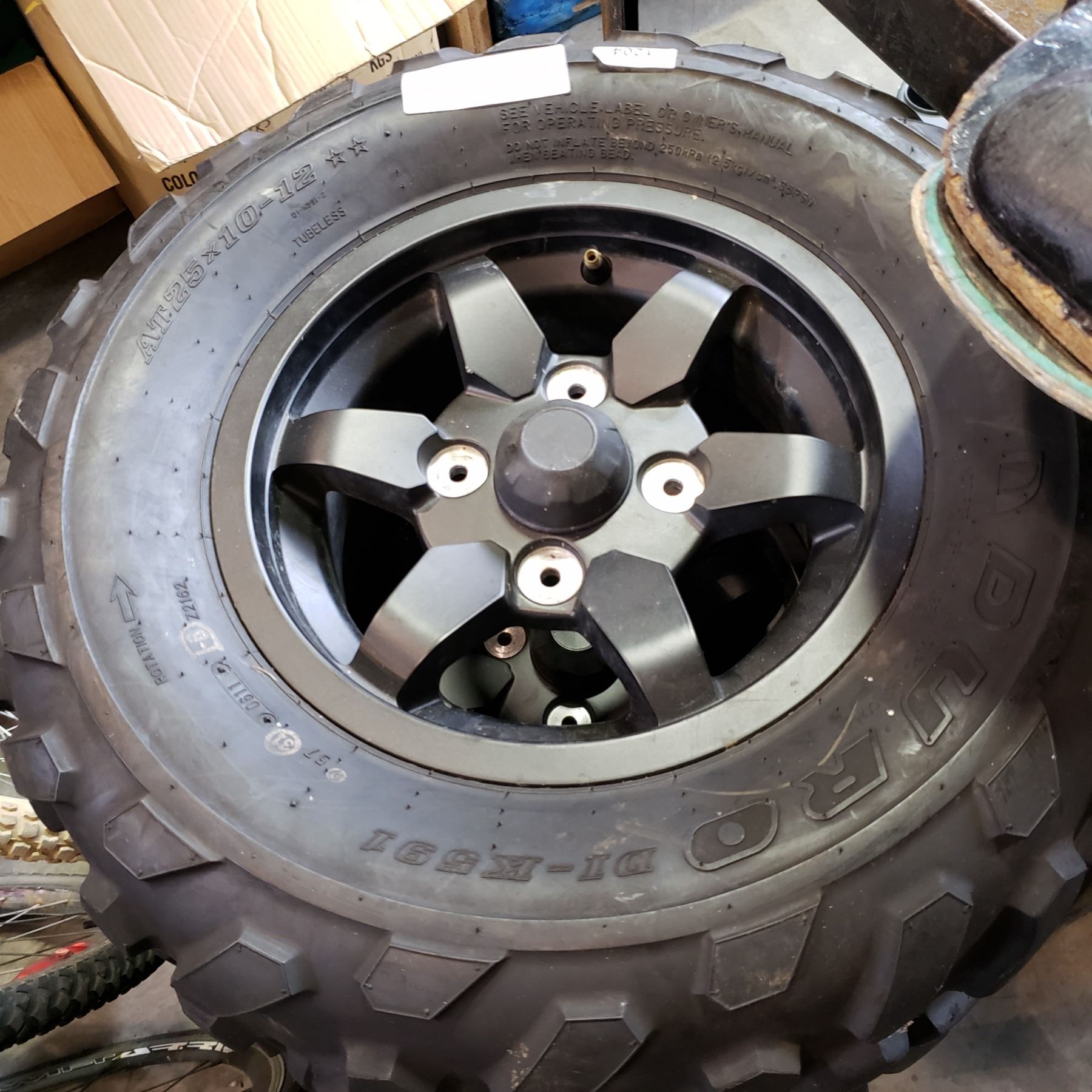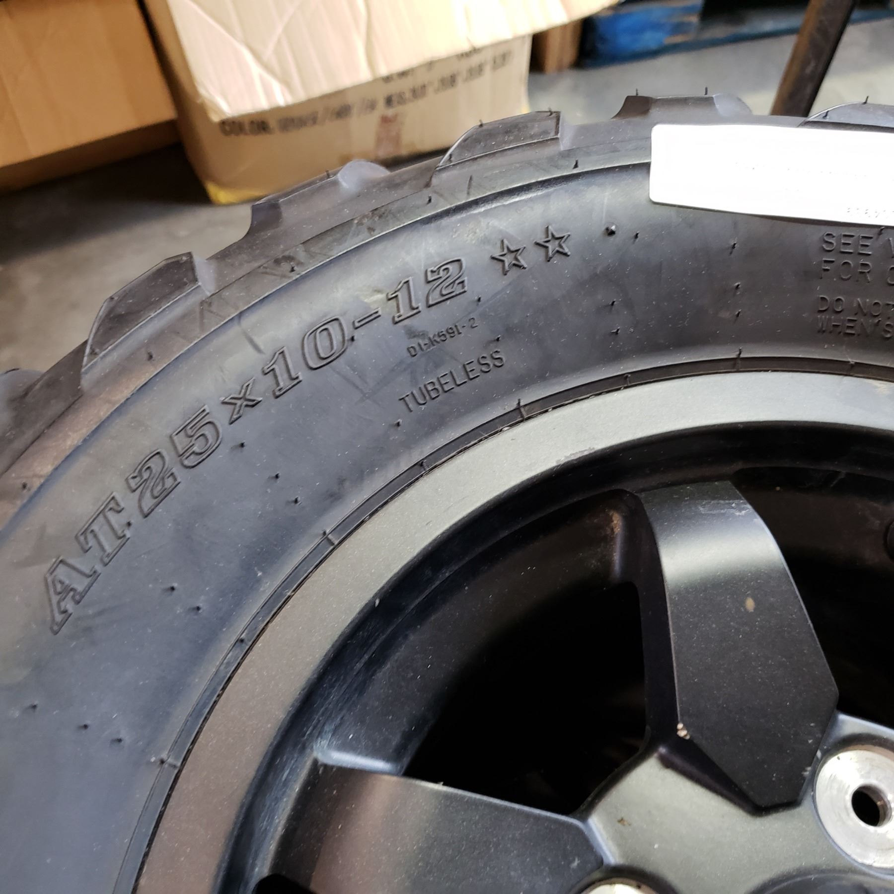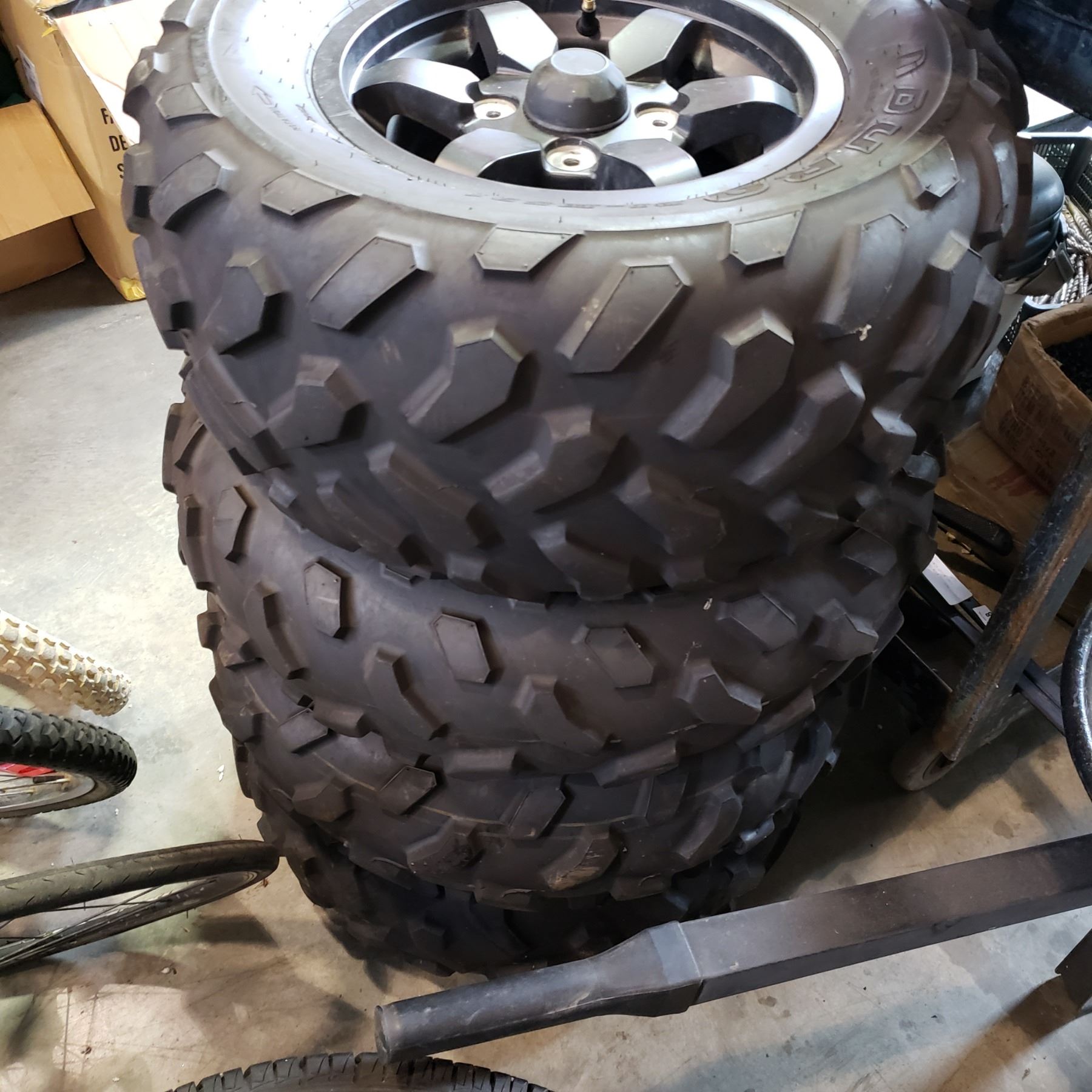 4 DURO DI-K591 AT TUBLESS ATV TIRES : 3 25x8-12 & 1 25x10-12 ON RIMS