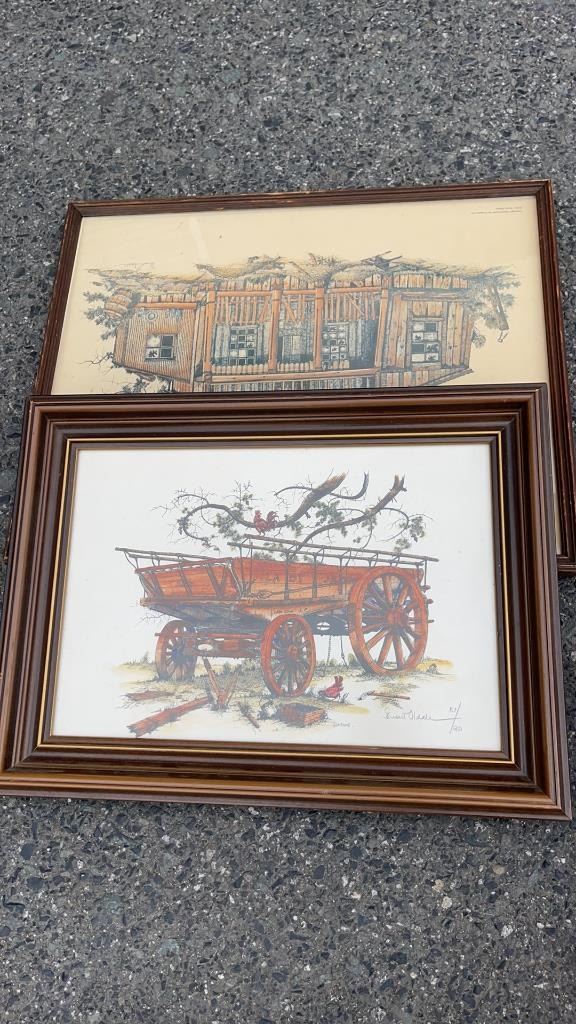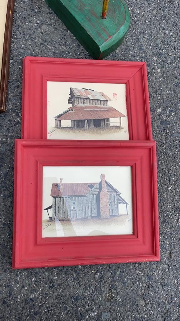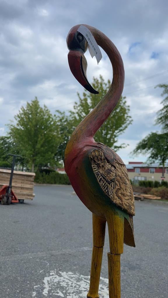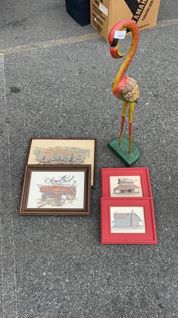 4 FRAMED PRINTS AND WOOD FLAMINGO ON STAND