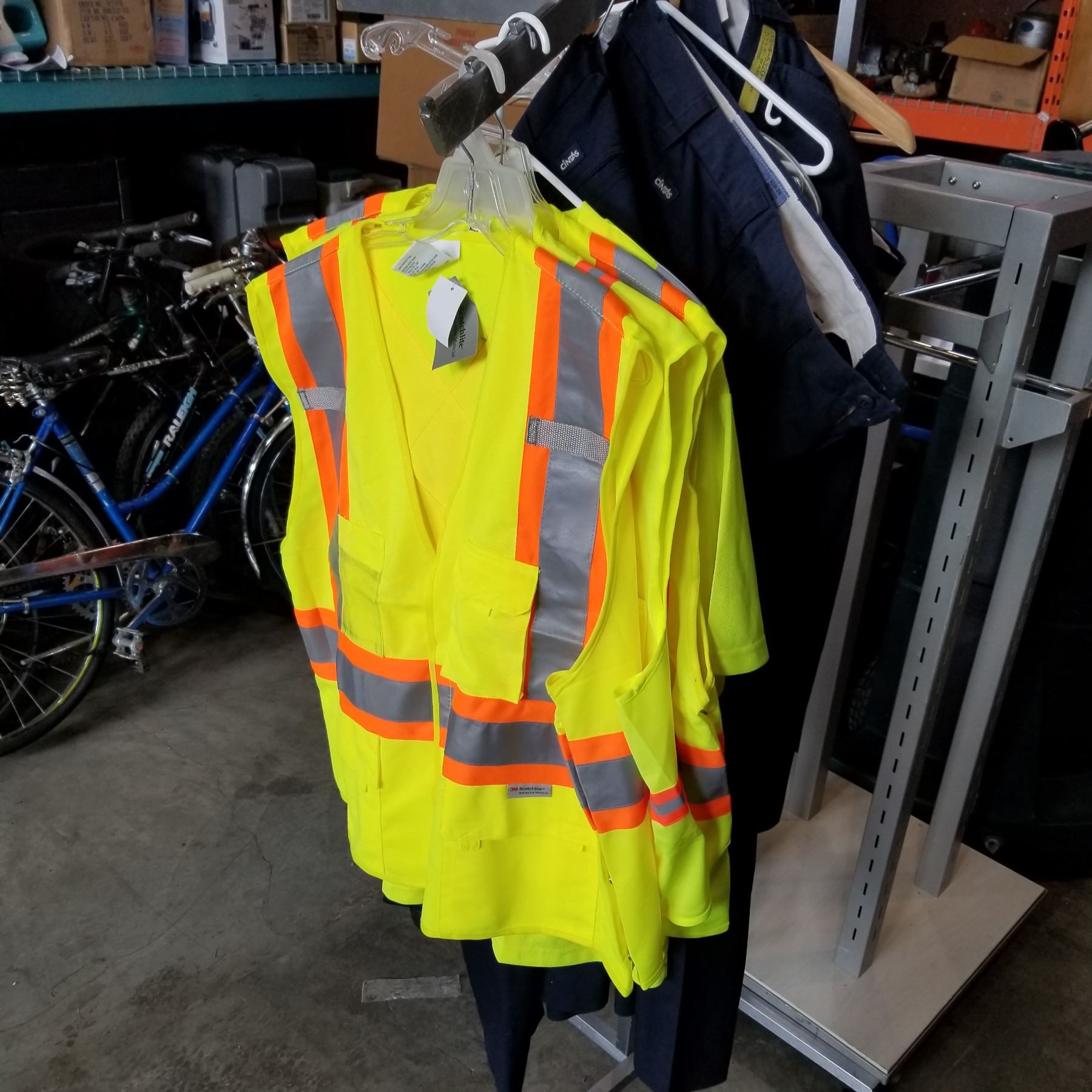 4 HI VIS SAFETY VESTS AND 6 WORK PANTS