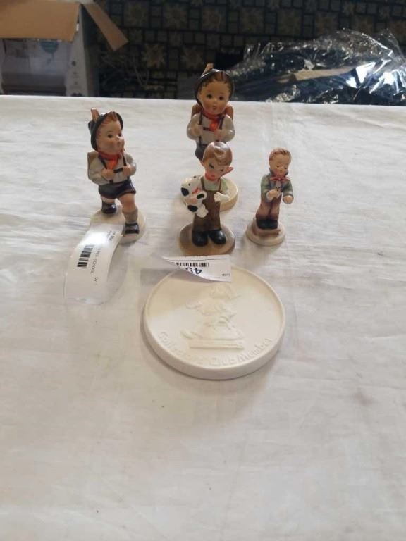 4 HUMMEL GOEBEL FIGURES - SCHOOL BOY, BOY WITH DOG, BAND LEADER AND SCHOOL BOY, INCLUDES COLLECTOR CLUB SHIELD