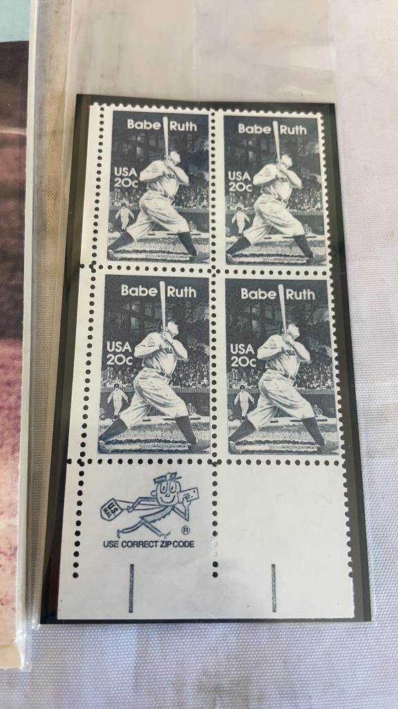 4 MINT BABE RUTH USA 20 CENT STAMPS, FOIL CARD BABE RUTH, BOOK #1 MICKEY MANTLE COMIC