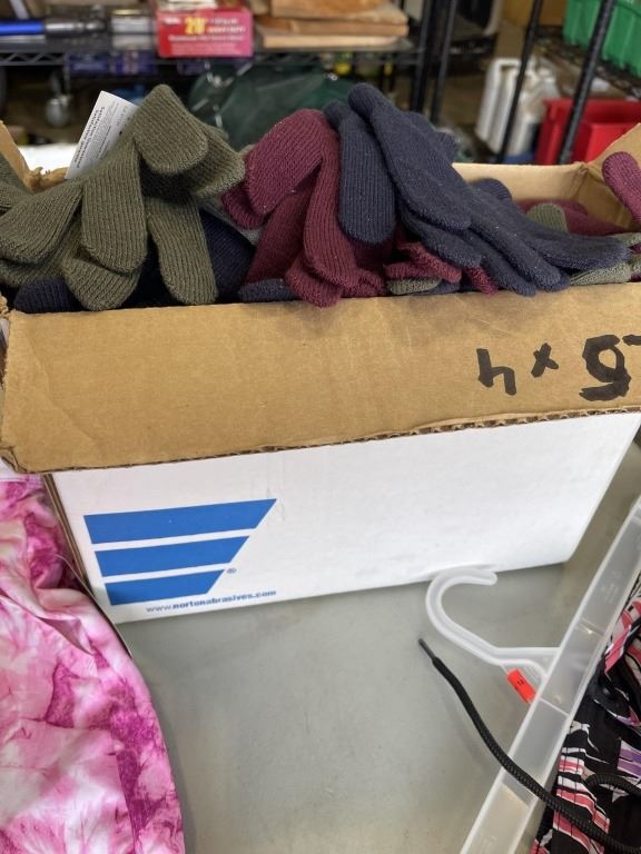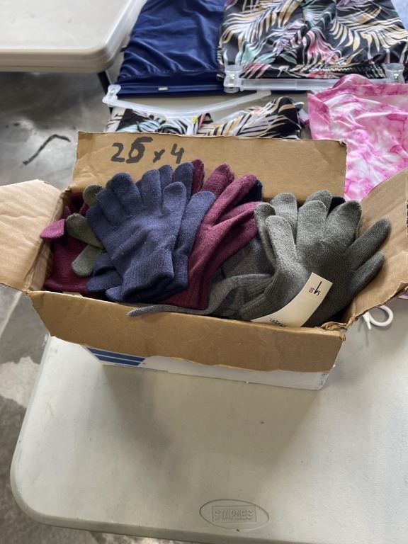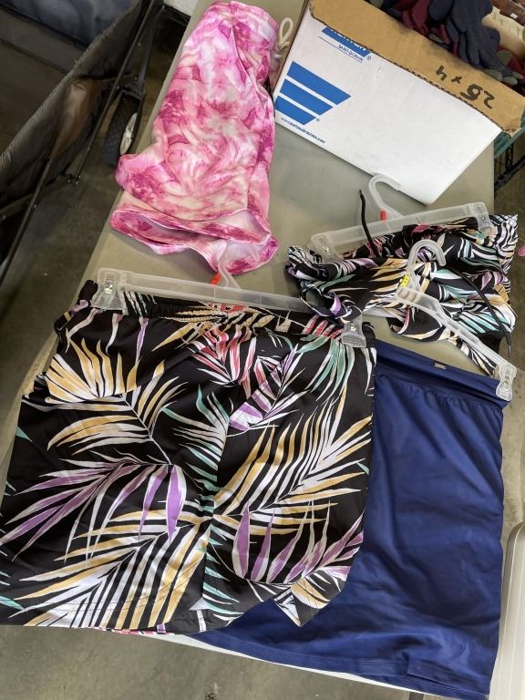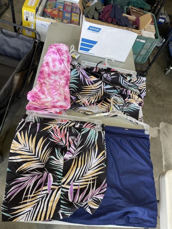 4 NEW BATHING SUIT BOTTOMS AND BOX OF NEW FINGER GLOVES