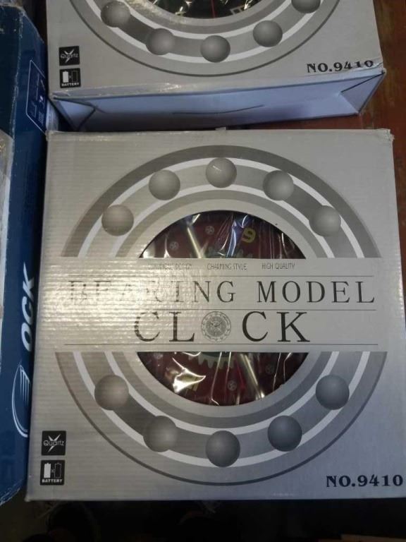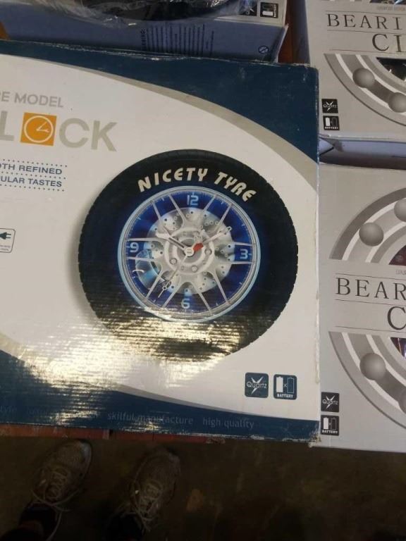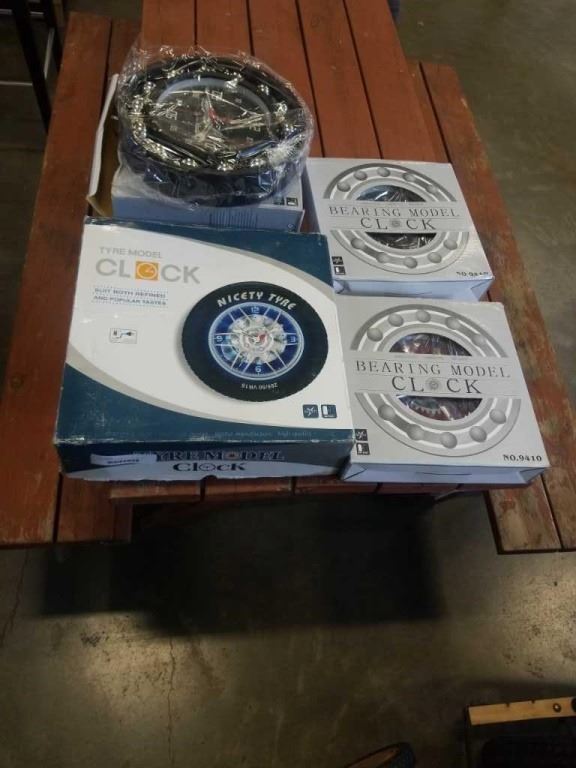 4 NEW BEARING WALL CLOCKS AND TIRE WALL CLOCK
