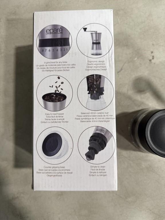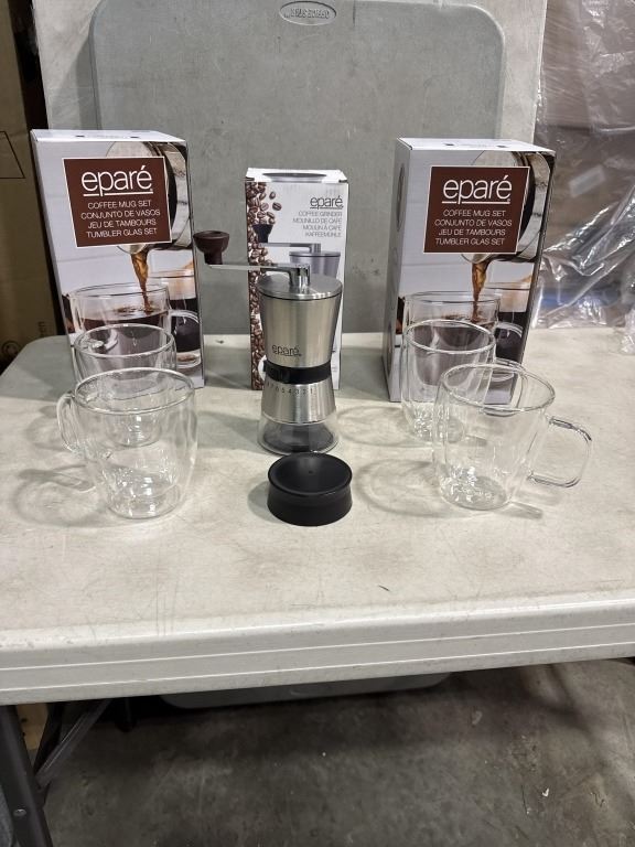 4 NEW EPARE DUAL WALL GLASS 12.OZ COFFEE MUGS AND STAINLESS COFFEE GRINDER