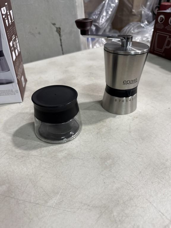 4 NEW EPARE DUAL WALL GLASS 12.OZ COFFEE MUGS AND STAINLESS COFFEE GRINDER