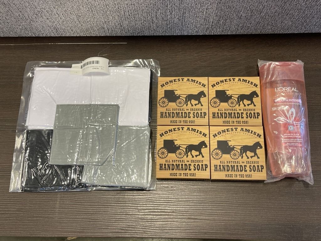 4 NEW HANDMADE SOAP, LOREAL SHAMPOO, AND PACK OF NECK BUFFS