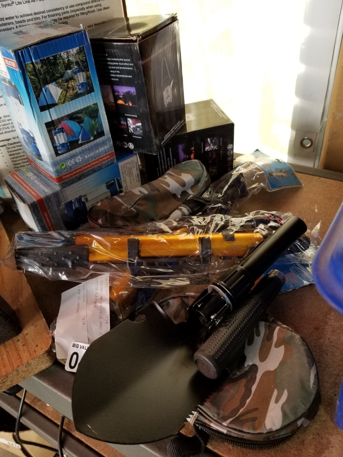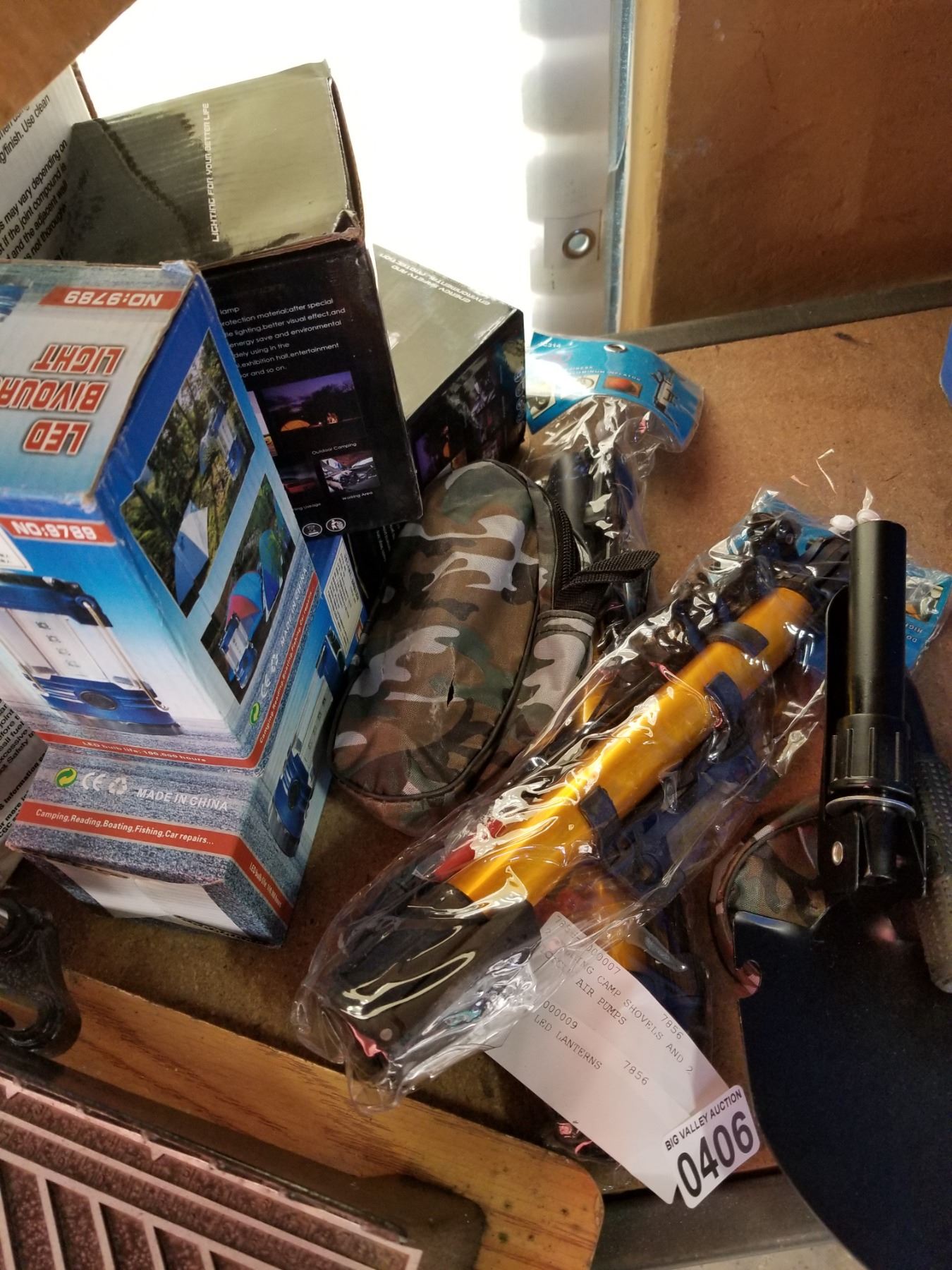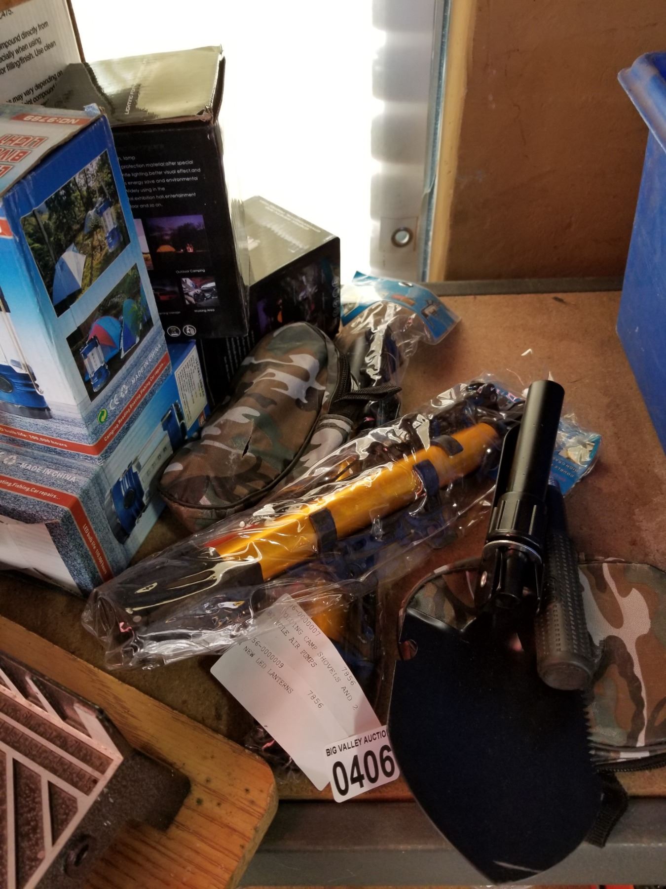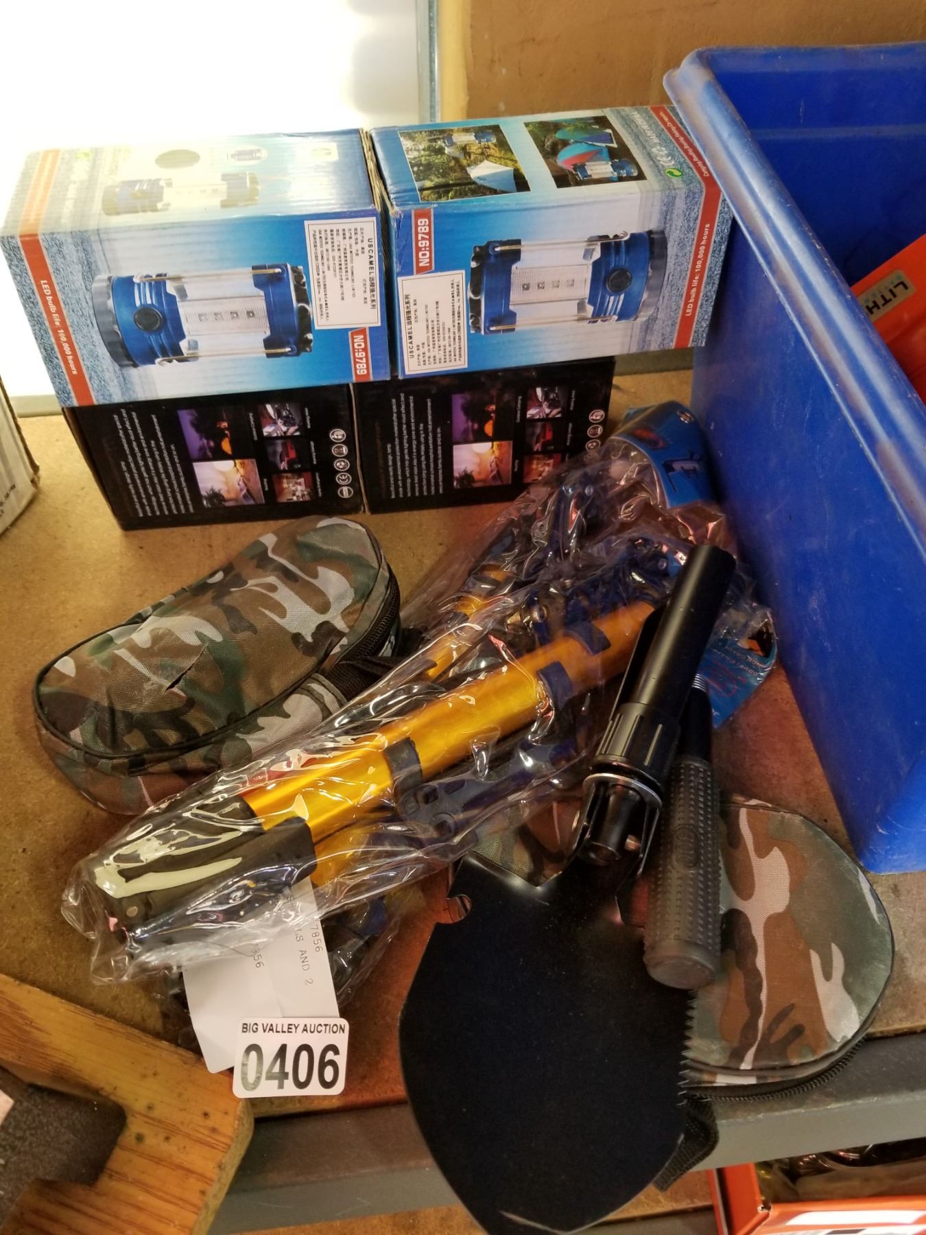 4 NEW LED LANTERNS AND 2 FOLDING CAMP SHOVELS AND 2 BICYCLE AIR PUMPS