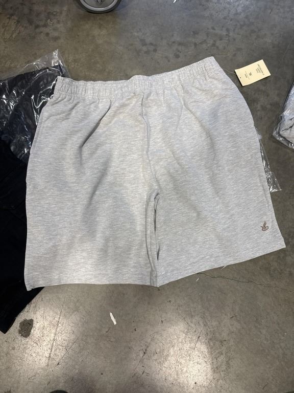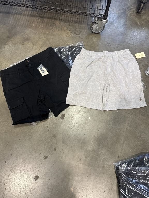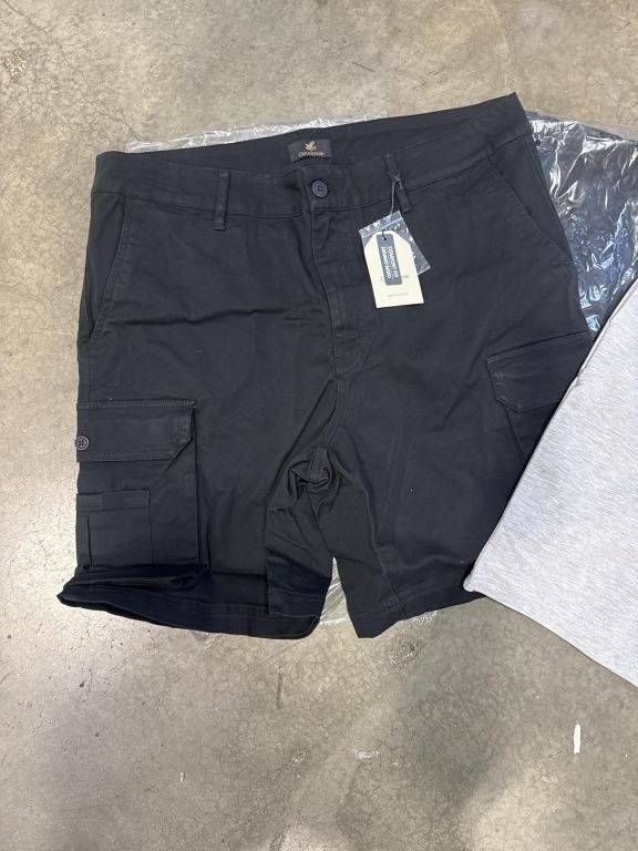 4 NEW PAIRS OF CLOUDPEAK SHORTS, 2 BLACK COTTON STRETCH CARGO PANTS SIZE 36, AND 2 HEATHER GREY SIZE XL