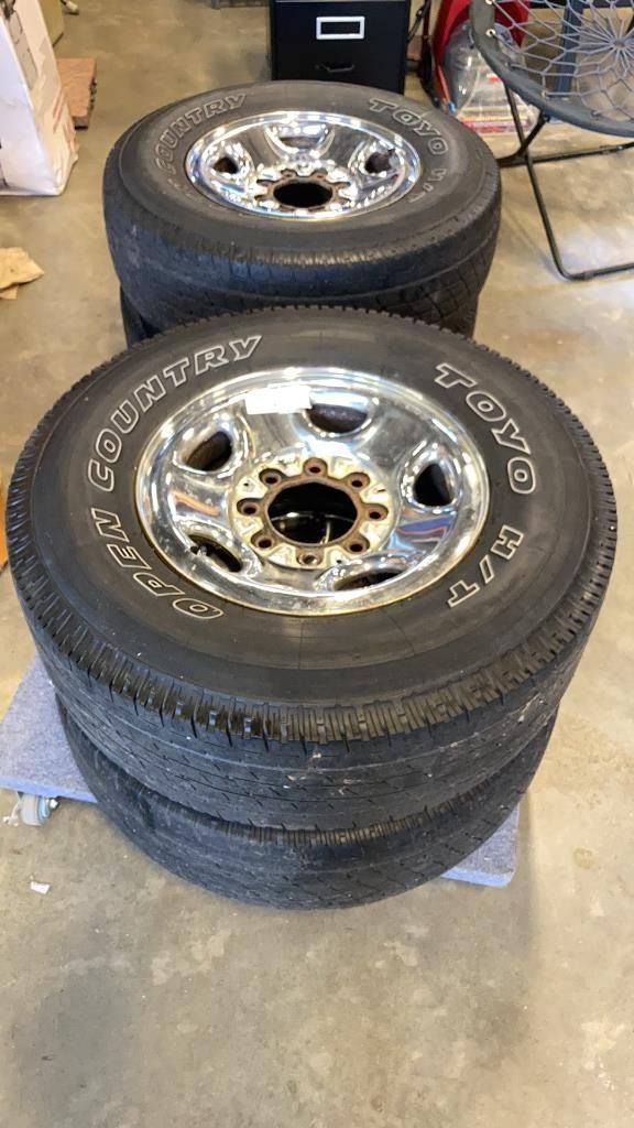 4 OPEN COUNTRY TOYO HT LT245/75 R16 TIRES ON 8 BOLT CHEVY RIMS
