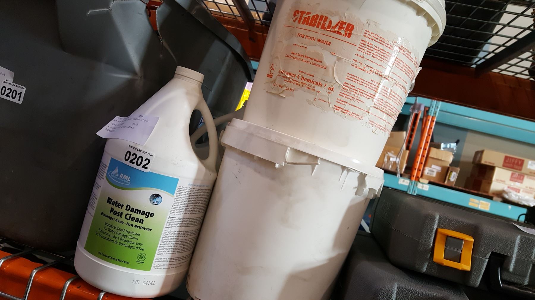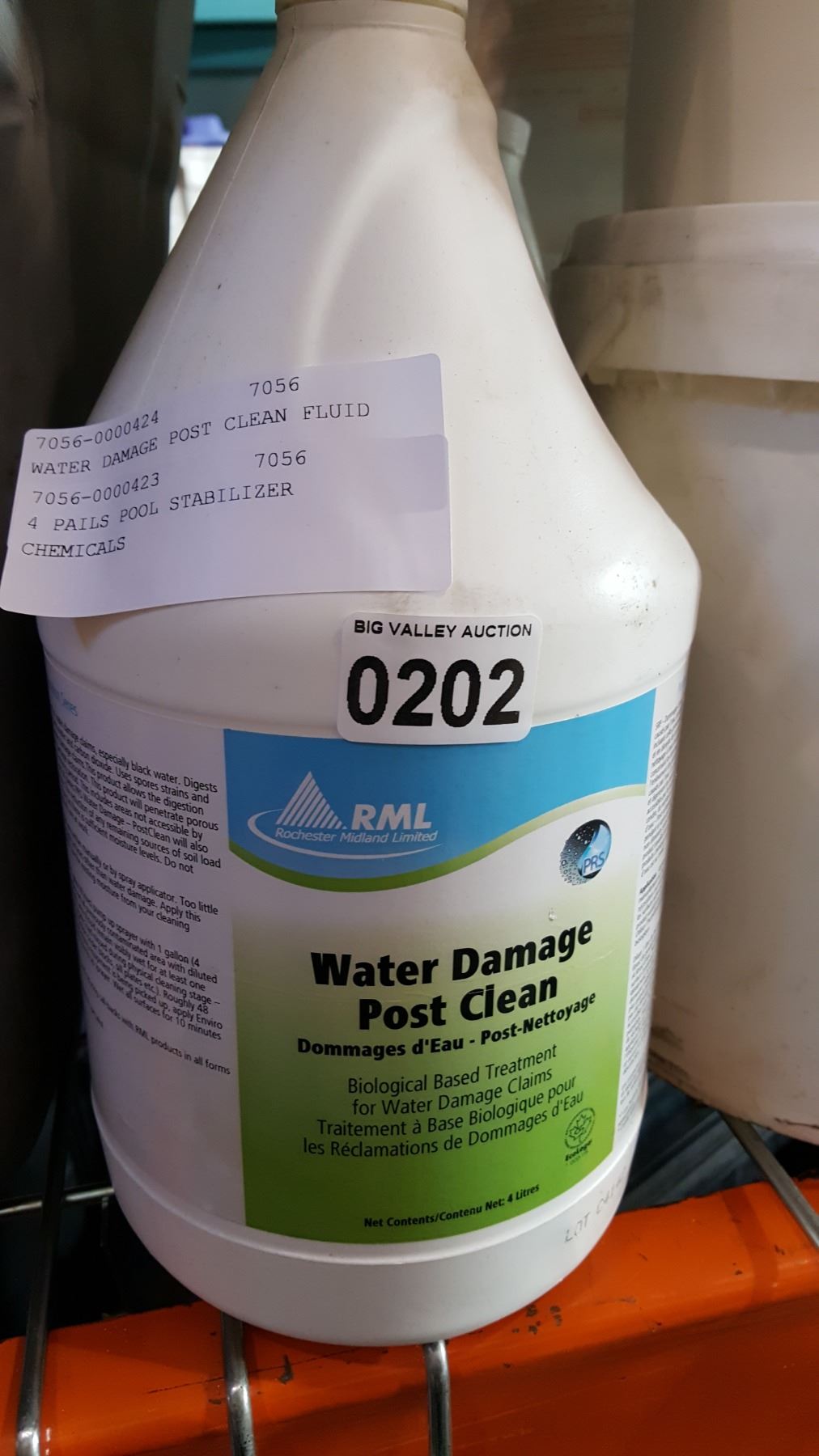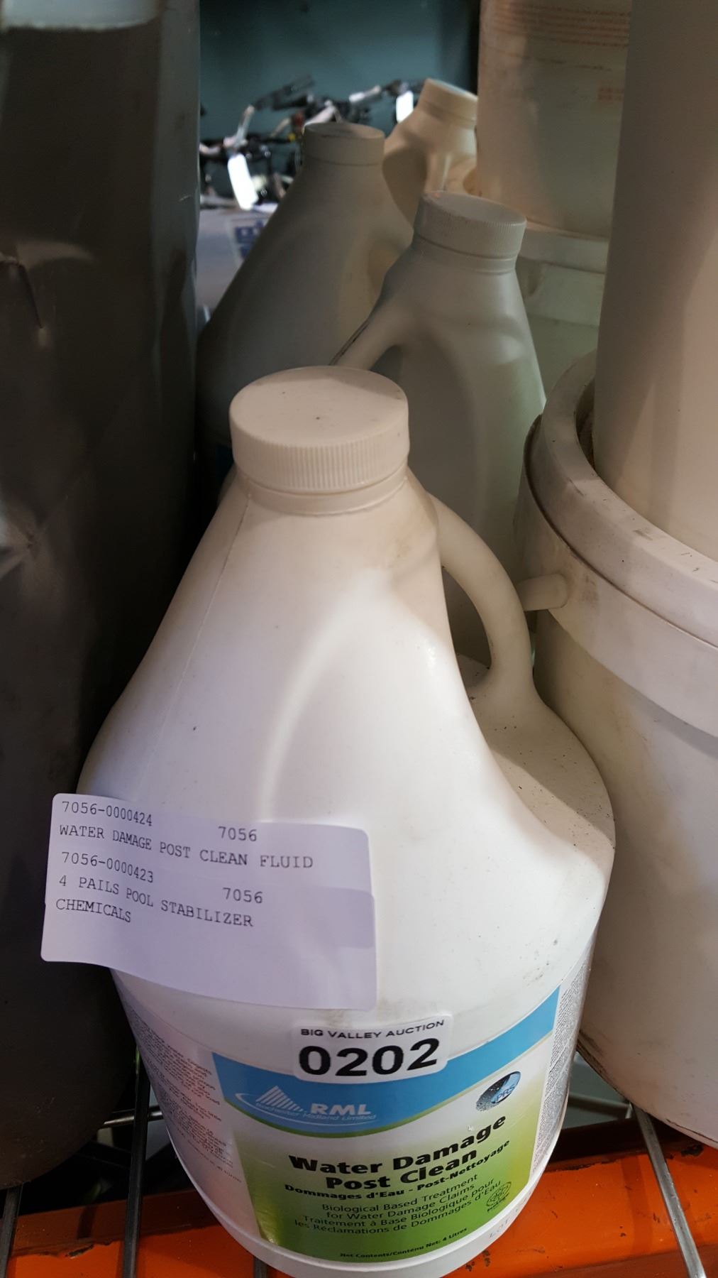 4 PAILS POOL STABILIZER CHEMICALS AND WATER DAMAGE POST CLEAN FLUID