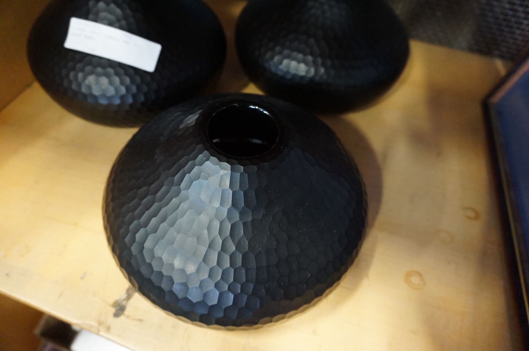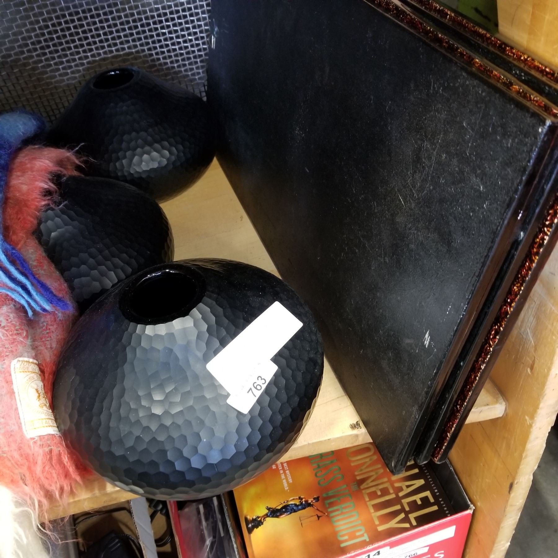4 PEARL INLAY PANELS AND 3 BLACK VASES