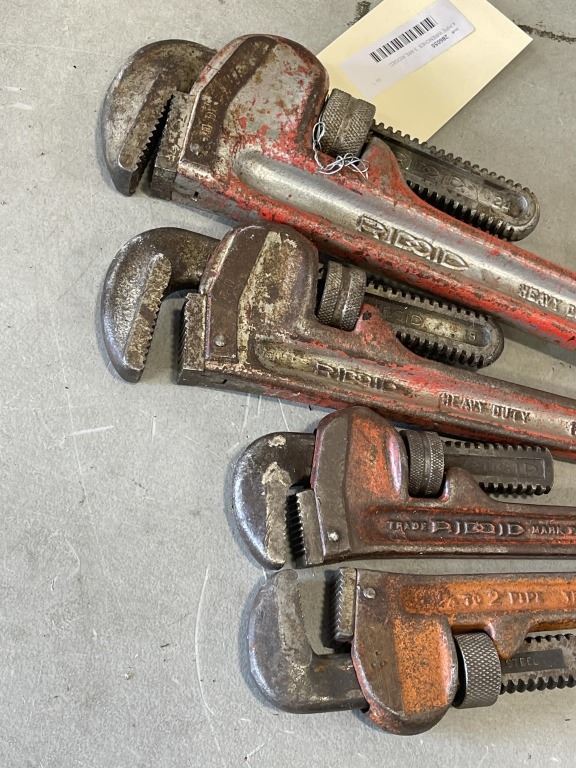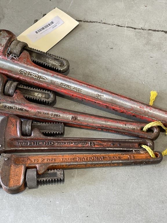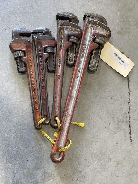 4 PIPE WRENCHES. 3 ARE RIDGED. LONGEST IS 24"