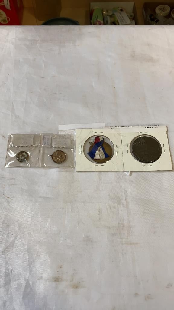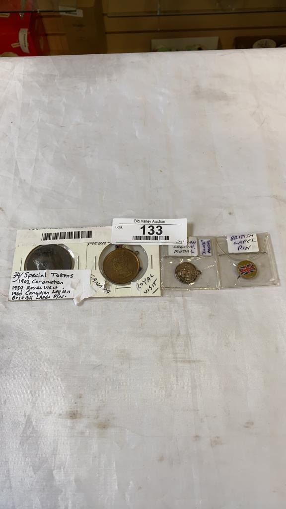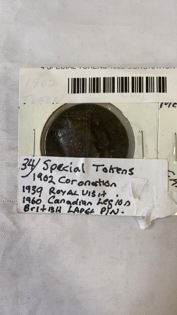 4 SPECIAL TOKENS 1902 CORONATION 1939 ROYAL VISIT 1960 CAN. LEGION, BRITISH LAPEL PIN