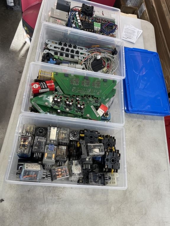4 TOTES OF VINTAGE ELECTRICAL REPAIR, TESTING, CONTACT ETC