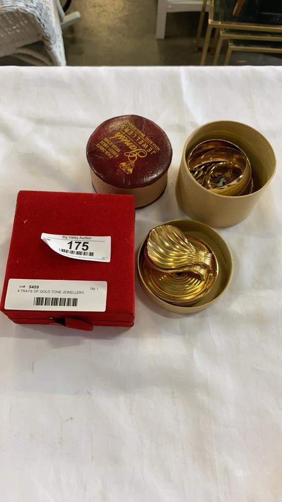4 TRAYS OF GOLD TONE JEWELLERY, DISHES, ETC