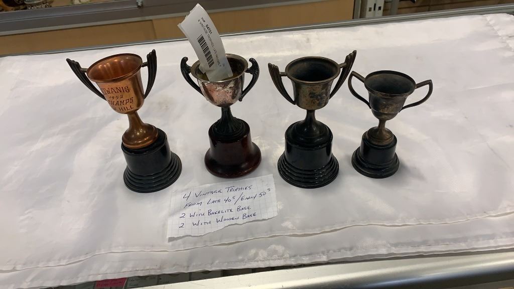 4 VINTAGE TROPHIES - LATE 1940'S EARLY 50s 2 WITH BAKELITE BASES, 2 WITH WOOD BASES