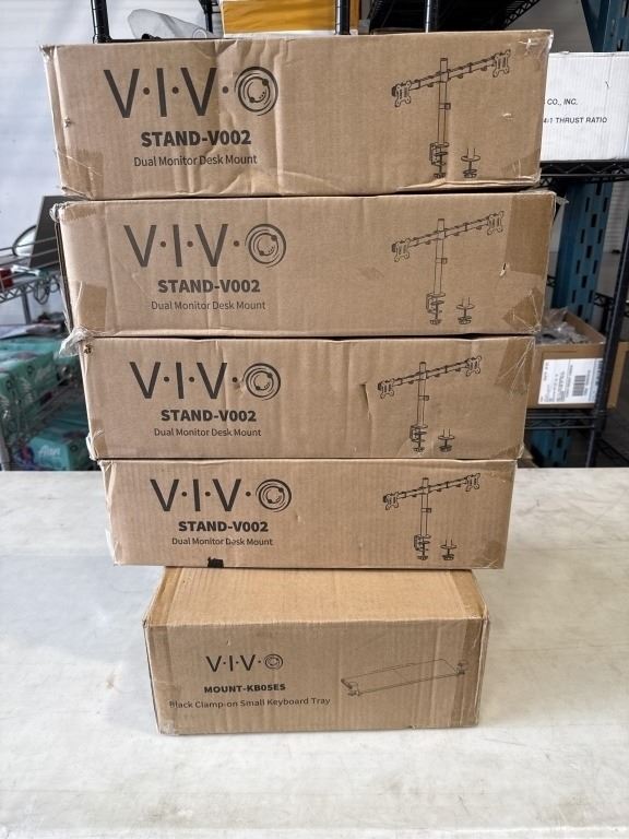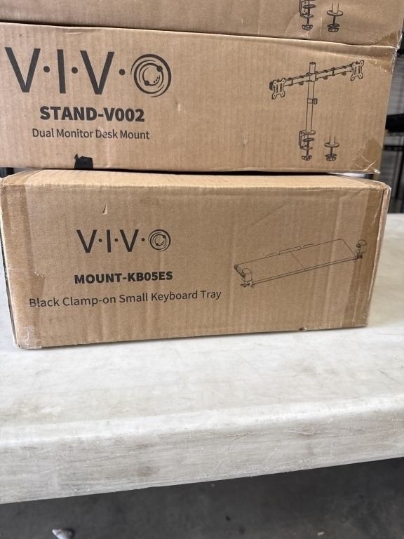 4 VIVO DUAL MONITOR DESK MOUNTS, AND VIVO KEYBOARD TRAY