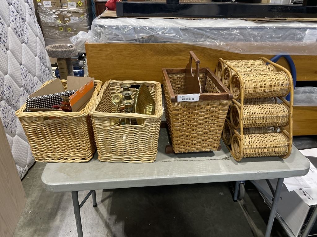 4 WICKER BASKETS AND WINE RACK, BRASS CANDLE HOLDERS, AND CANDLES