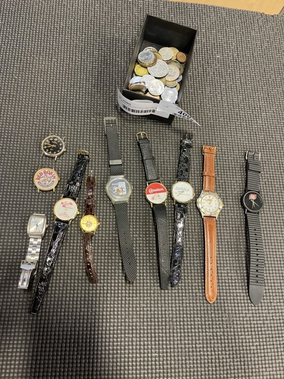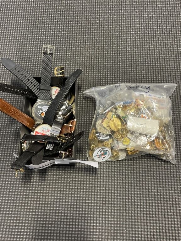 40 HOCKEY RELATED PINS AND AND 10 ASSORTED ADVERTISING WATCHES