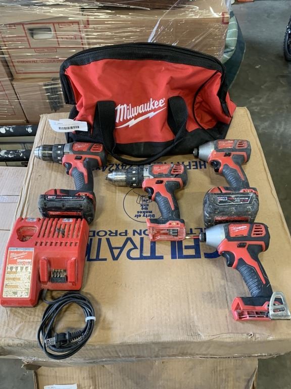 4PC M18 MILWAUKEE SET, INCLUDING 2 MILWAUKEE IMPACT GUNS, 2 DRILLS AND 2 BATTERIES, WITH CHARGER AND