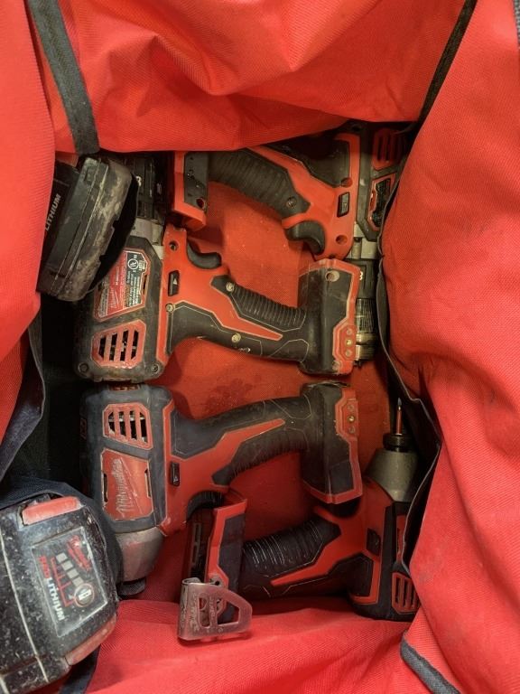 4PC M18 MILWAUKEE SET, INCLUDING 2 MILWAUKEE IMPACT GUNS, 2 DRILLS AND 2 BATTERIES, WITH CHARGER AND BAG