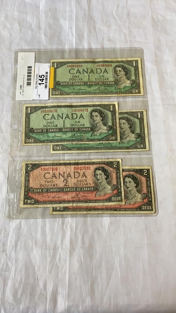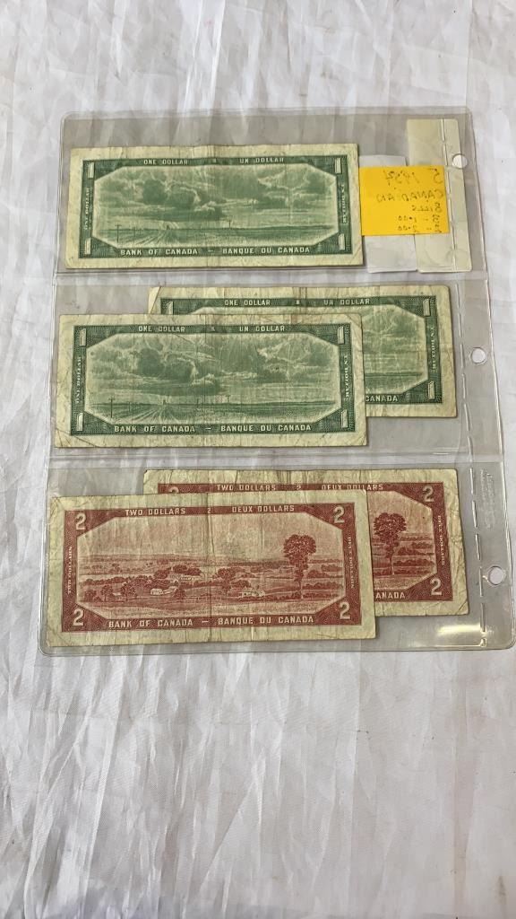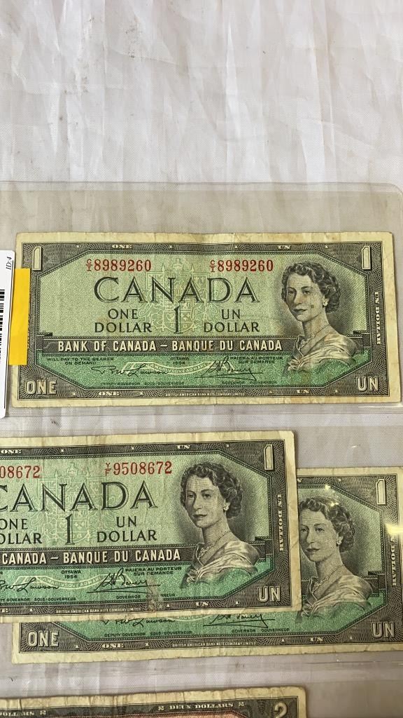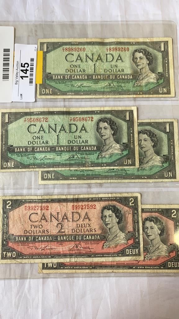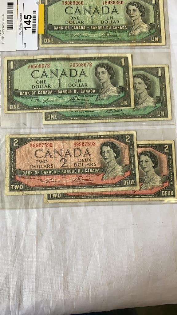 5 1954 CANADIAN BILLS - 3 1 DOLLAR BILLS AND 2 DOLLAR BILLS
