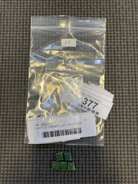 5 ANTIQUE CARVED DARK GREEN JADE PENDANTS, ALL SAME DESIGN