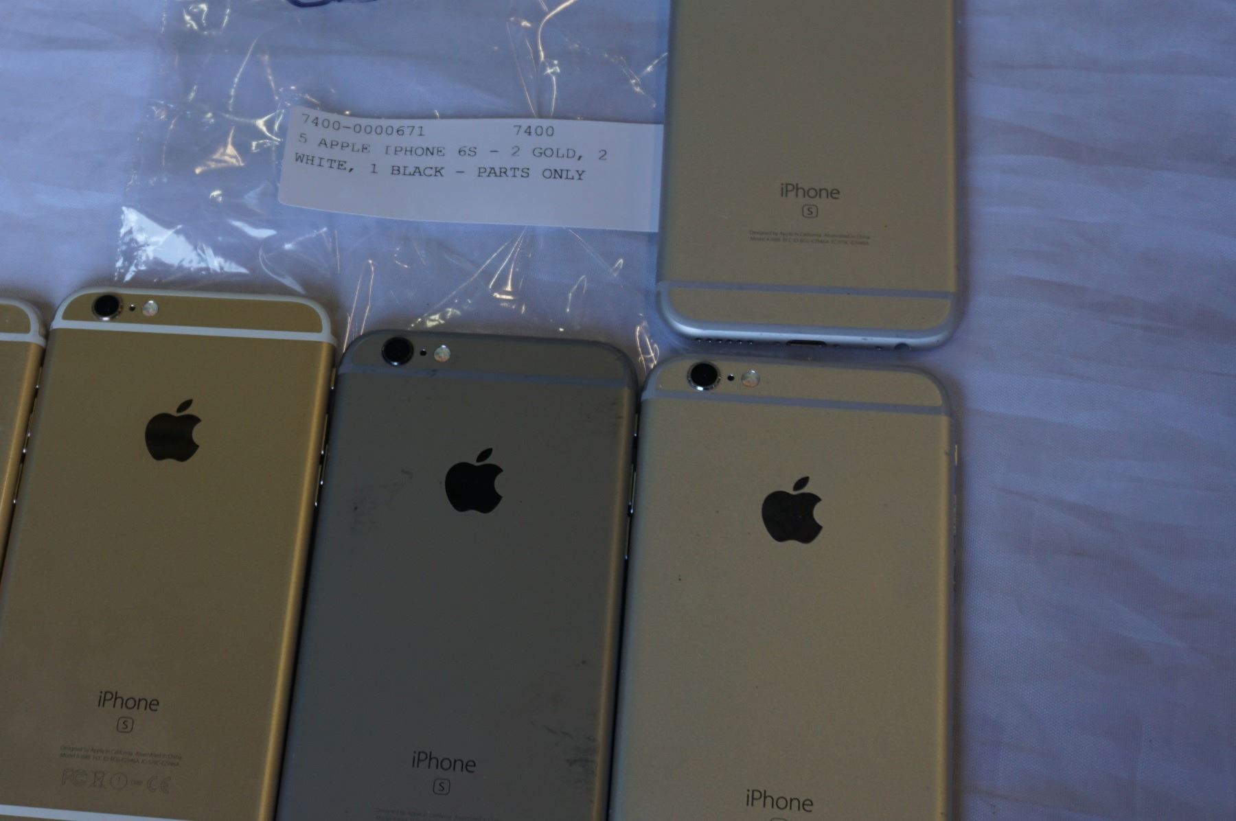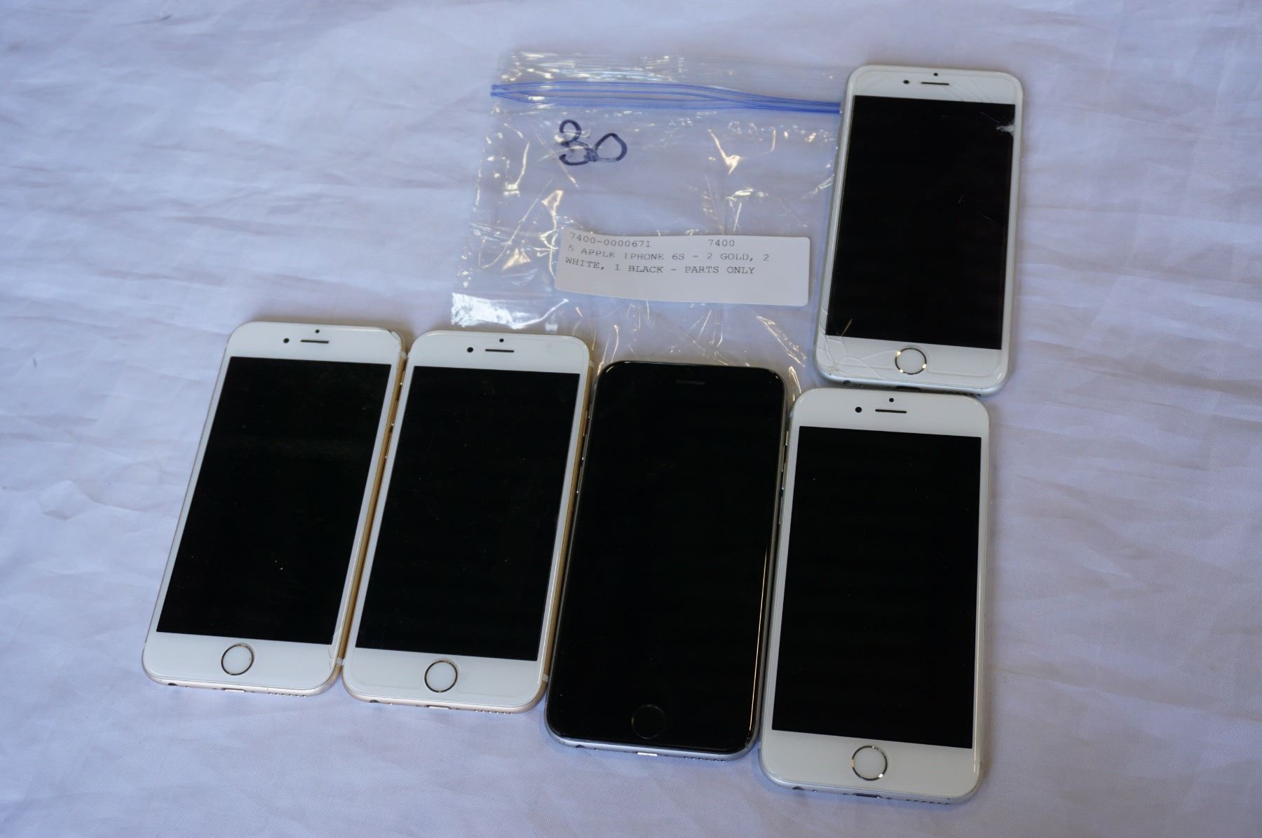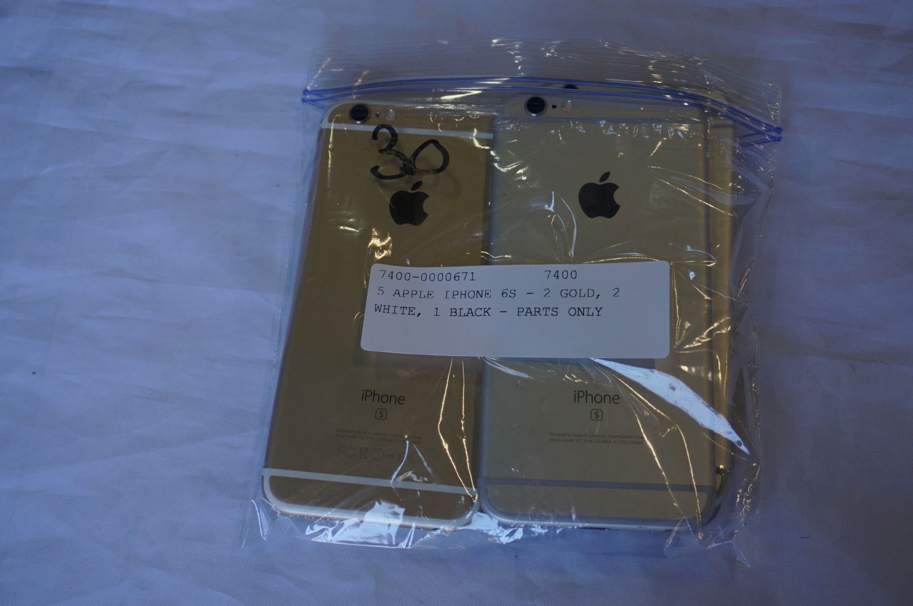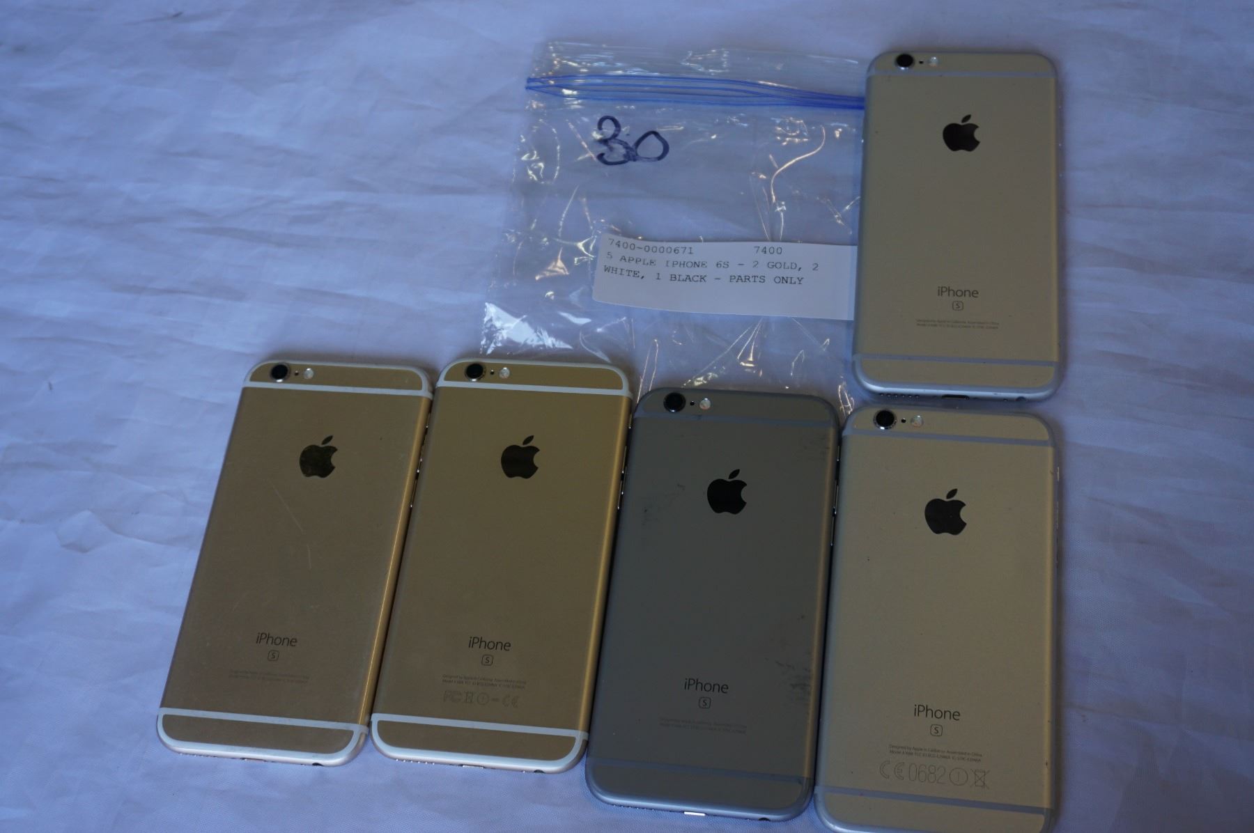5 APPLE IPHONE 6S - 2 GOLD, 2 WHITE, 1 BLACK - PARTS ONLY