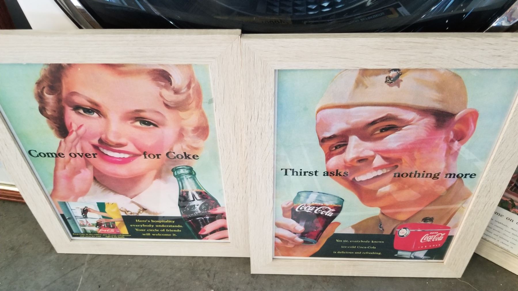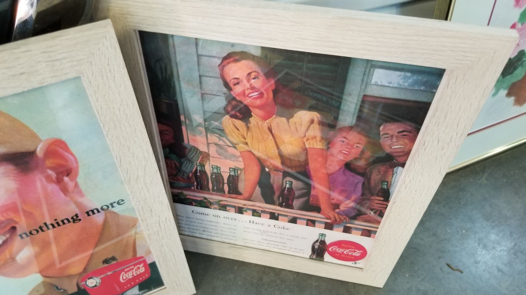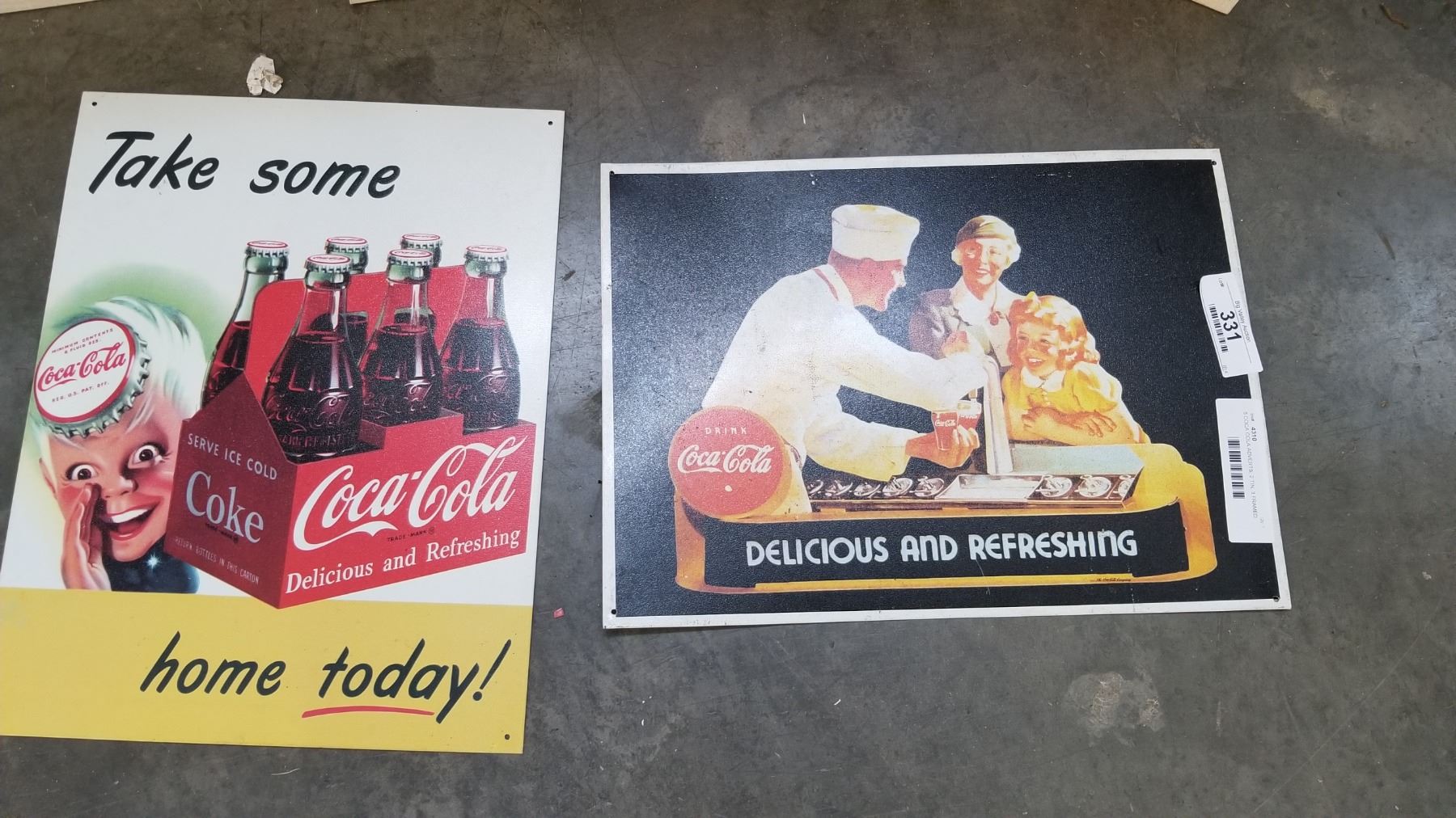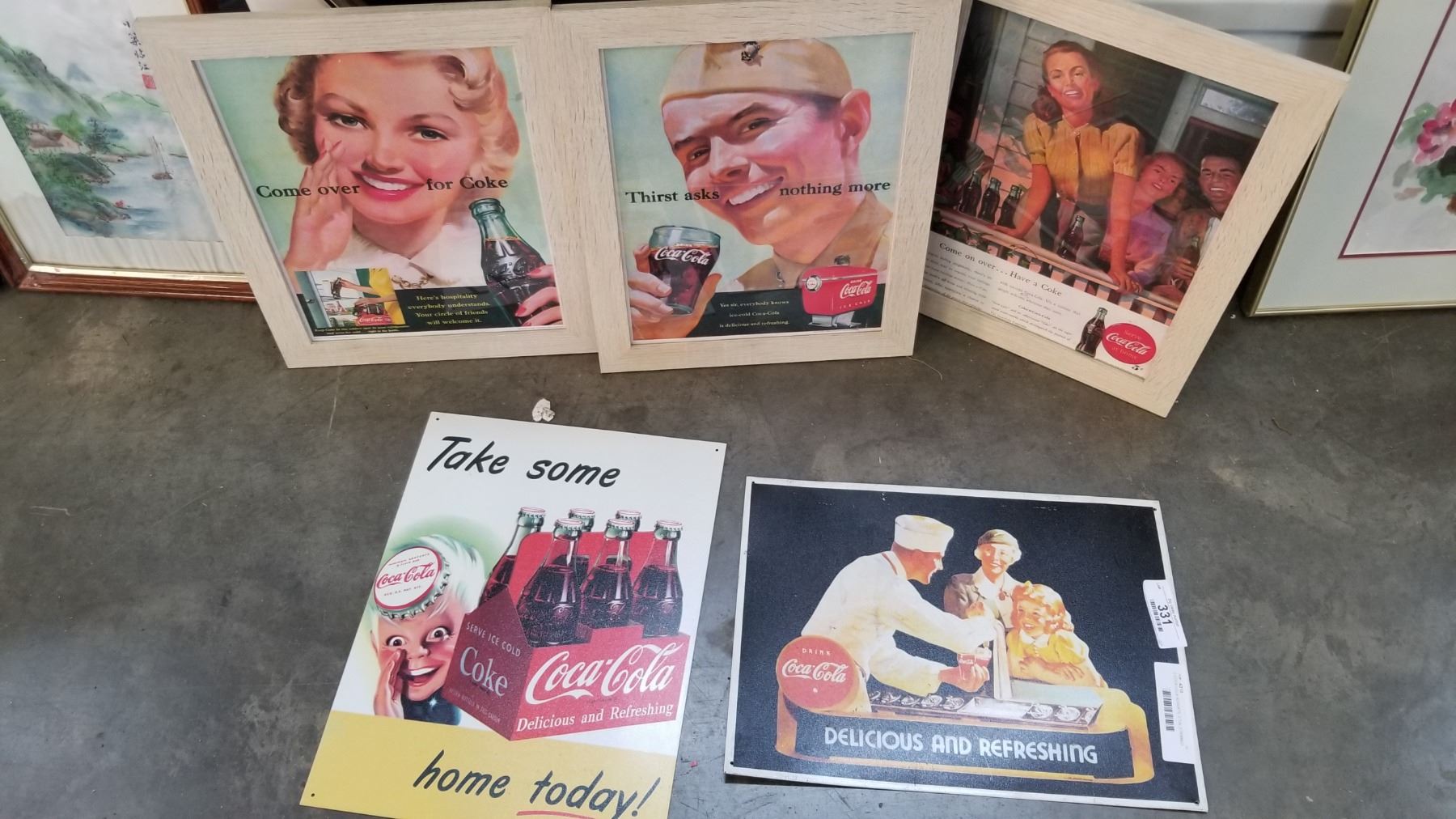 5 COCA COLA ADVERTS, 2 TIN, 3 FRAMED