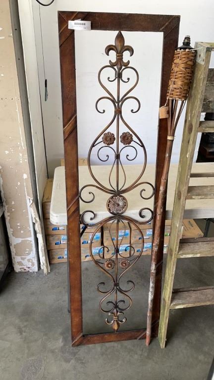 5 FOOT WOOD A FRAME LADDER, METAL ART AND TIKI TORCH