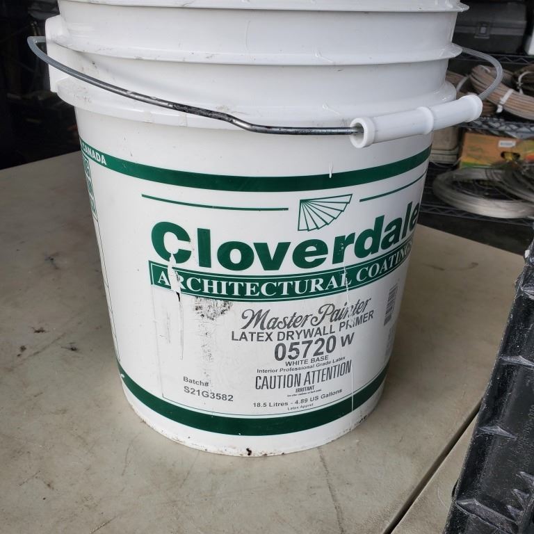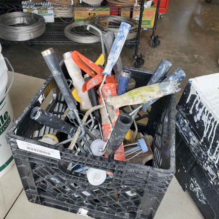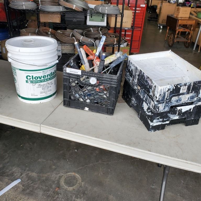 5 GALLON PAIL OF LATEX DRYWALL PRIMER AND CRATE OF ROLLERS/BRUSHES