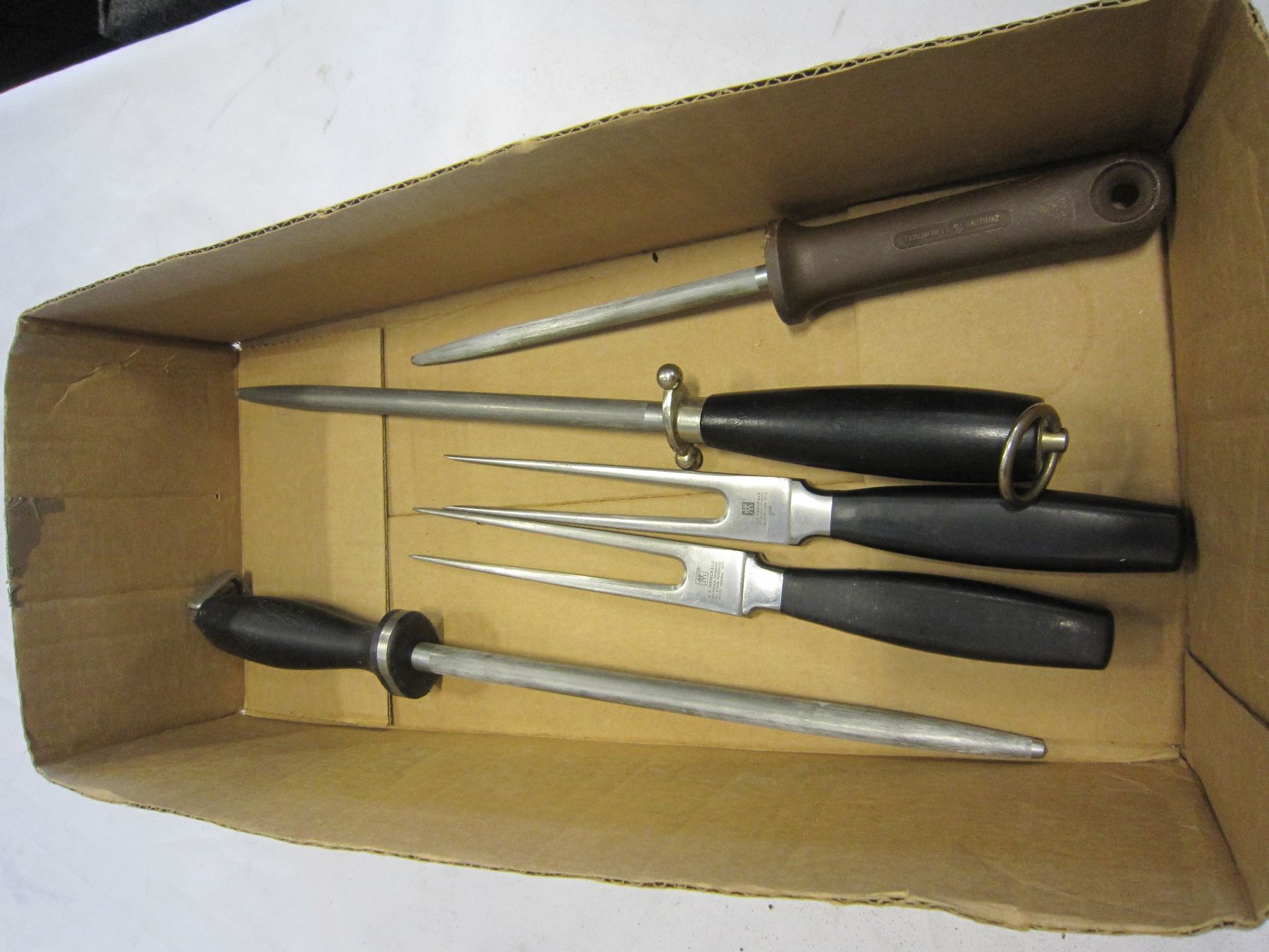 5 HENCKELS TOOLS 3 STEELS AND 2 CARVING FORKS