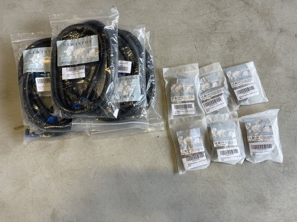 5 NEW SHOWER HOSES AND 6 NEW SETSOF SHELF PINS