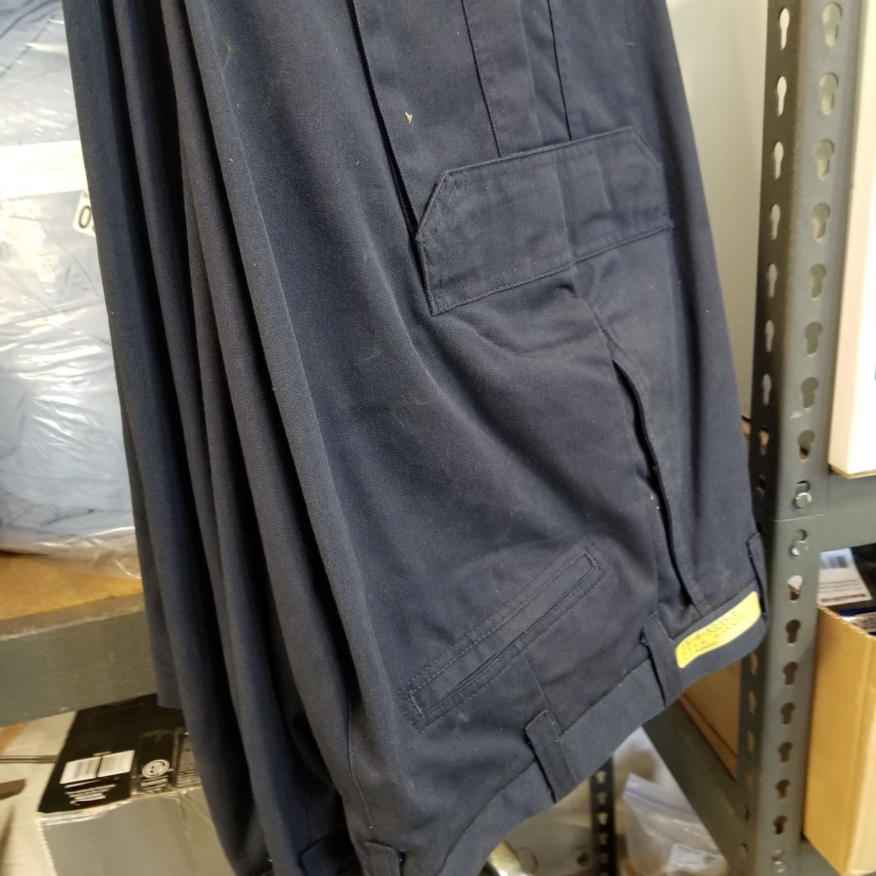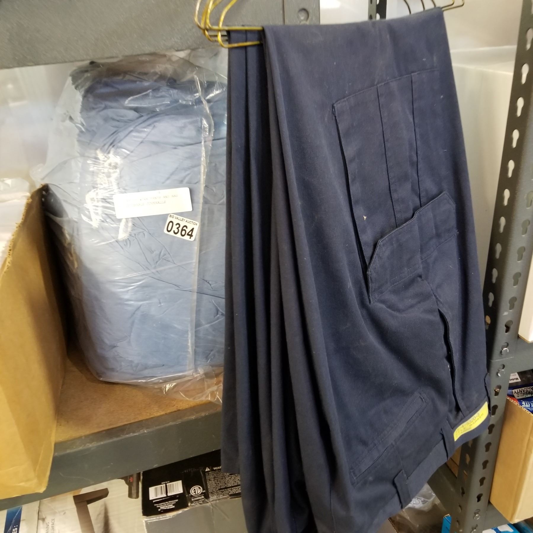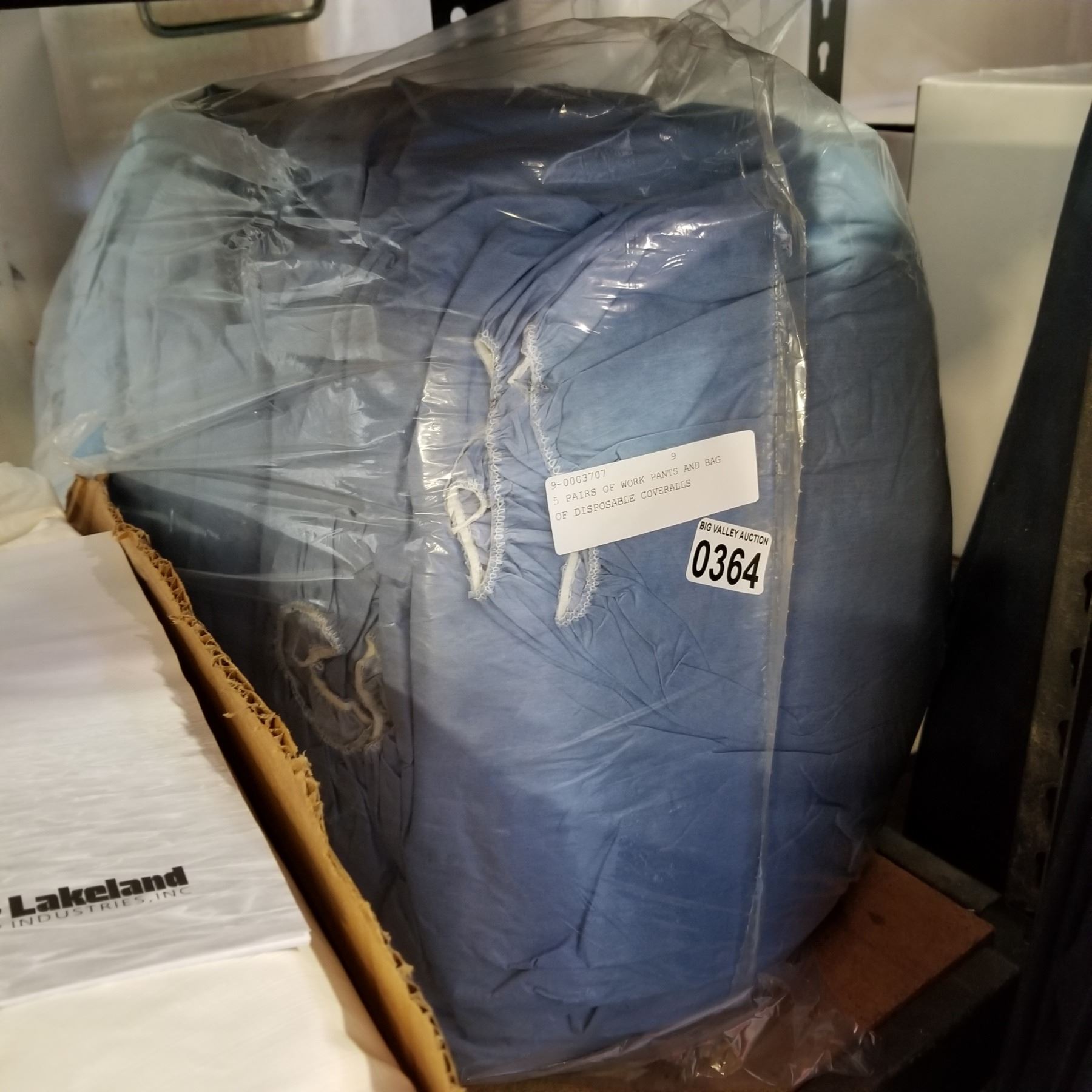 5 PAIRS OF WORK PANTS AND BAG OF DISPOSABLE COVERALLS
