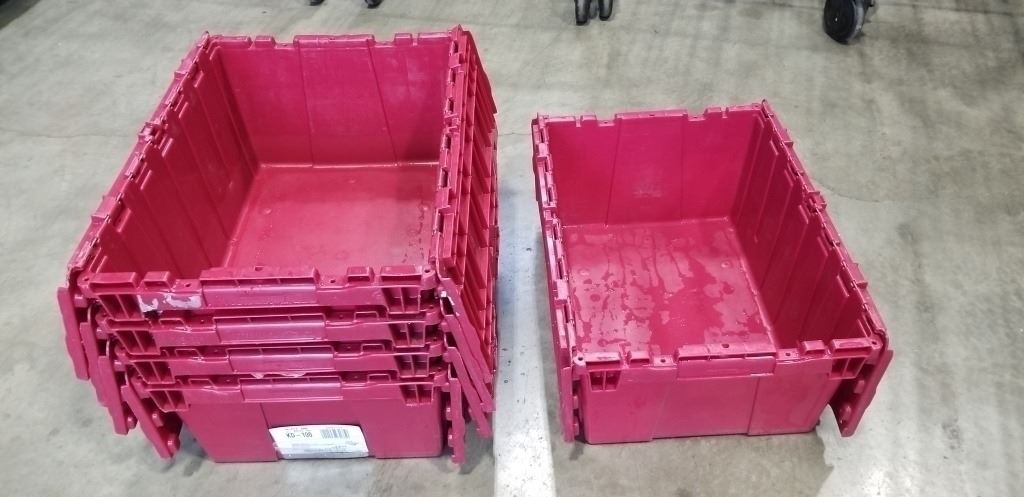 5 PLASTIC TOTES W/ BUILT IN LIDS