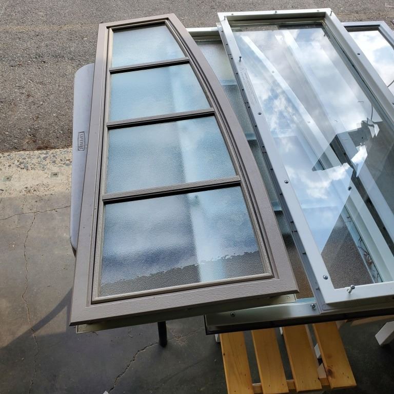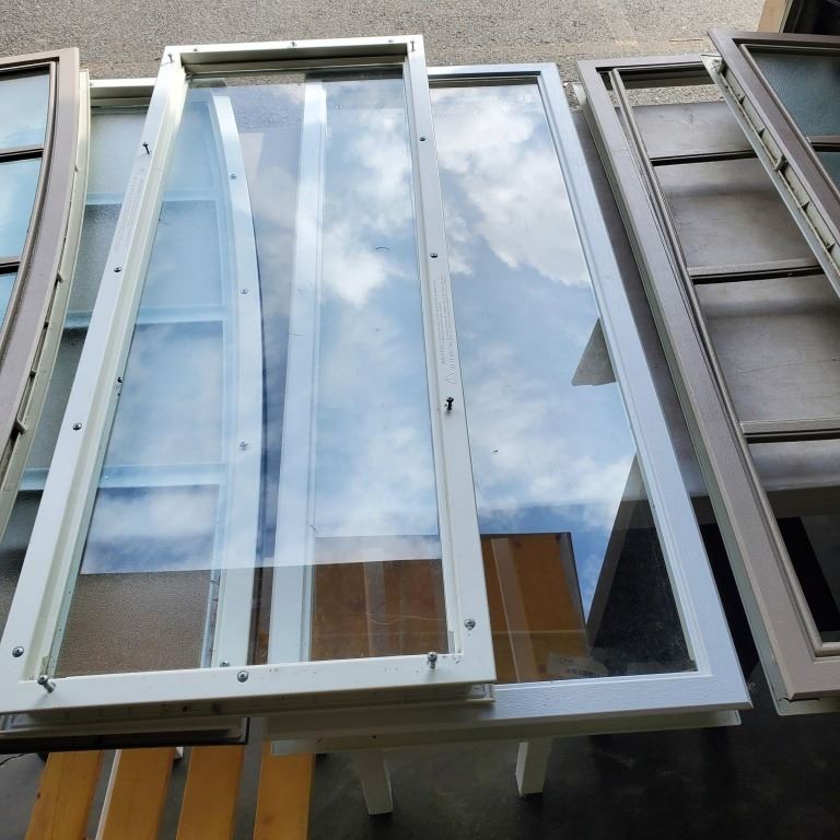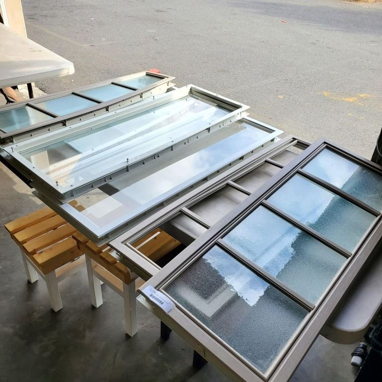 5 SINGLE PANE FORT OR SHED WINDOWS AND EXTRA FRAME 2 ARE SLANTED 2 ARE CLEAR 3 ARE FROSTED 42" X 16"