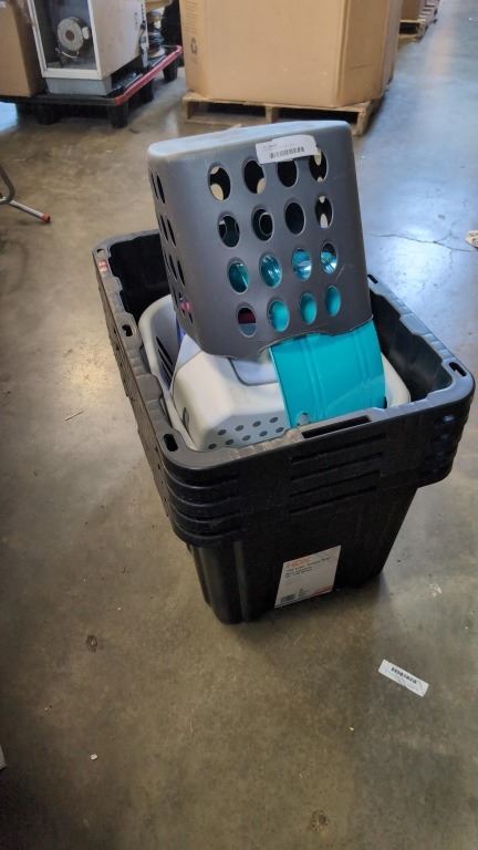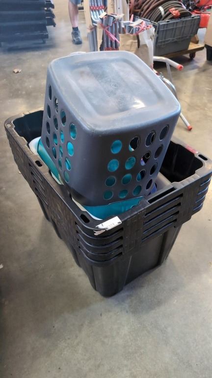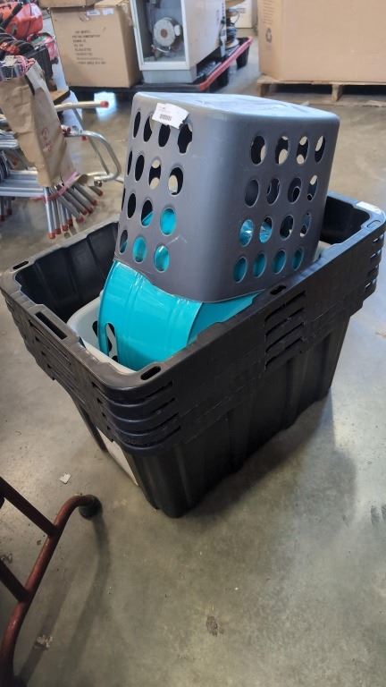 5 STORAGE TOTES 102 L EACH AND BASKET OF CAONTAINERS