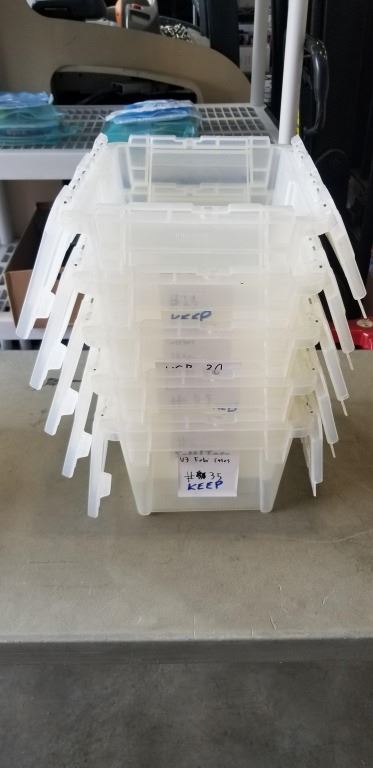 5 ULINE PLASTIC TOTES WITH ATTACHED LID, GOOD CONDITION, NO CRACKS