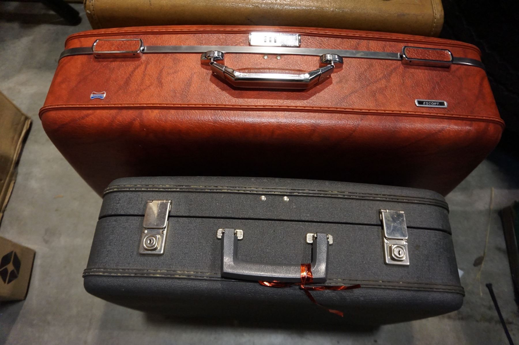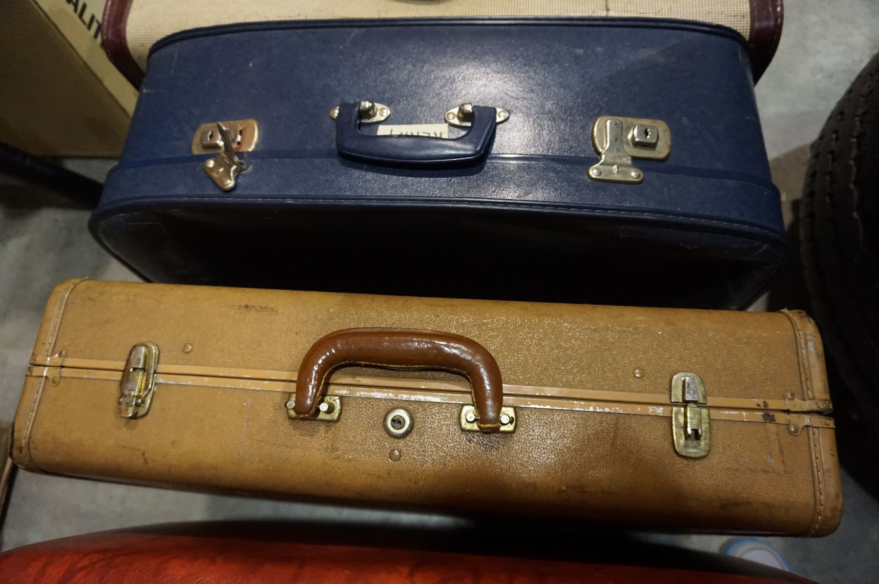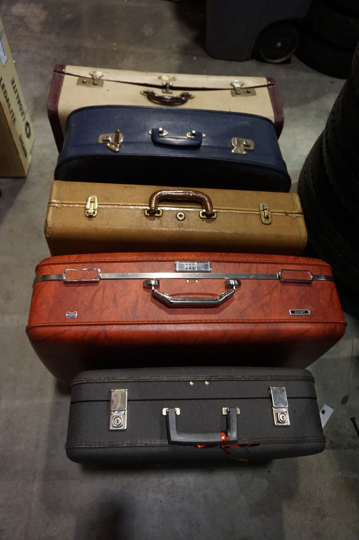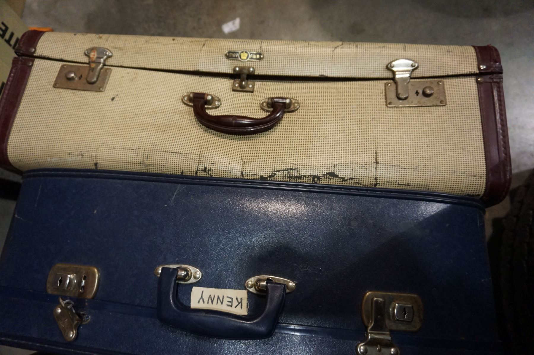 5 VINTAGE SUITCASES W/ BOX OF ESTATE GOODS AND BABY GATE