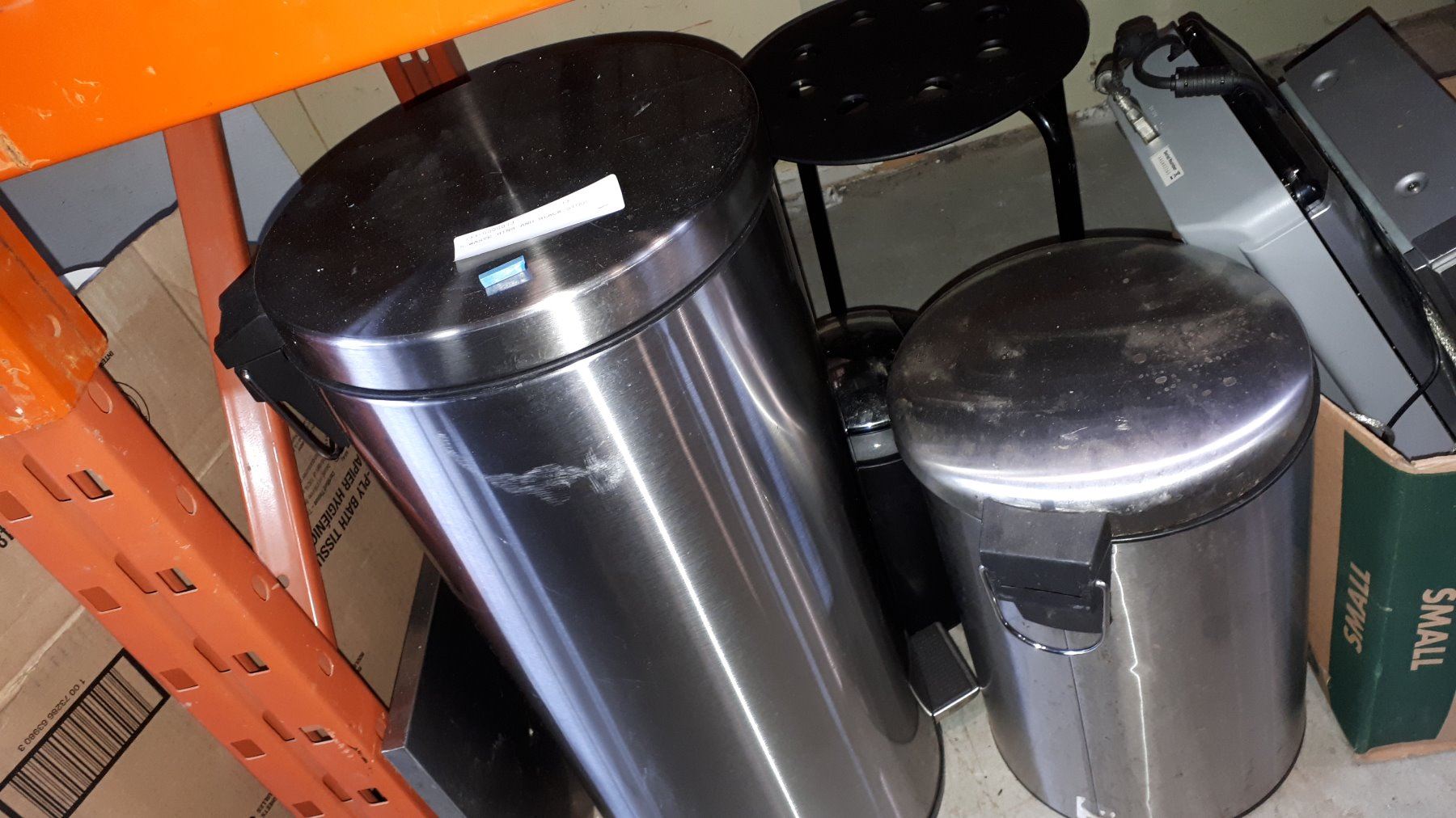 5 WASTE BINS AND BLACK STOOL