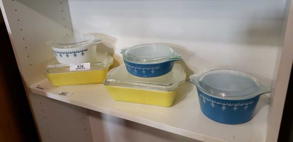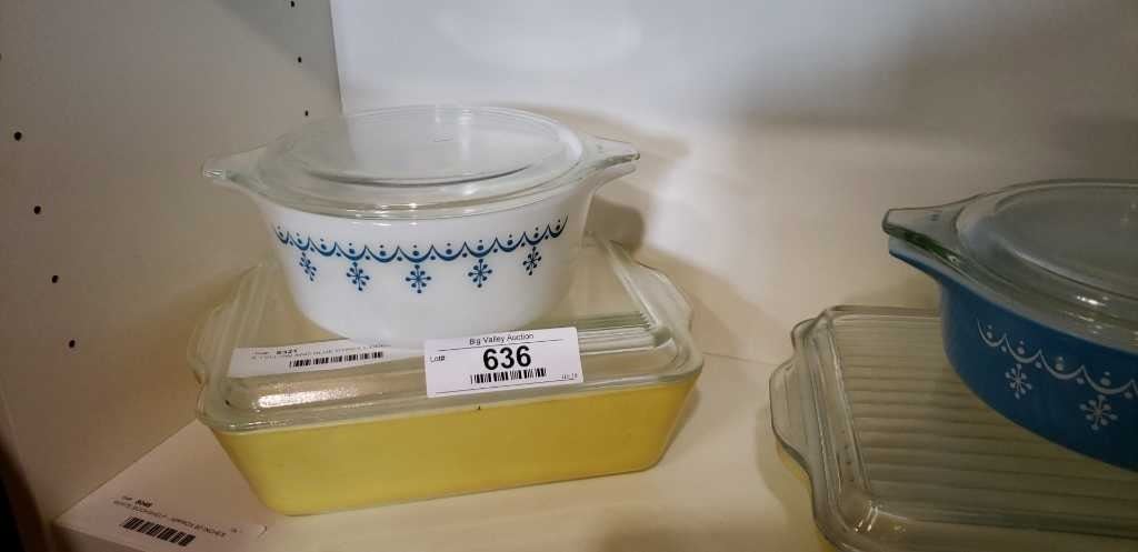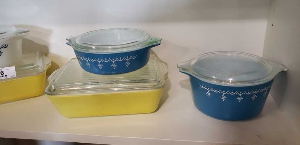 5 YELLOW AND BLUE PYREX LIDDED DISHES