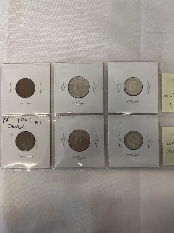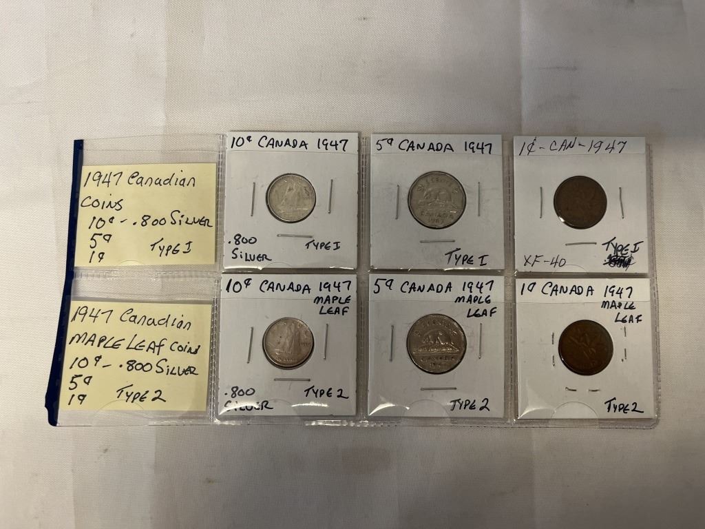 6 - 1947 CANADIAN COINS BOTH PLAIN (TYPE 1) MAPLE LEAF (TYPE 2) DIMES - .800 SILVER PLUS 5 CENT AND 1 CENT