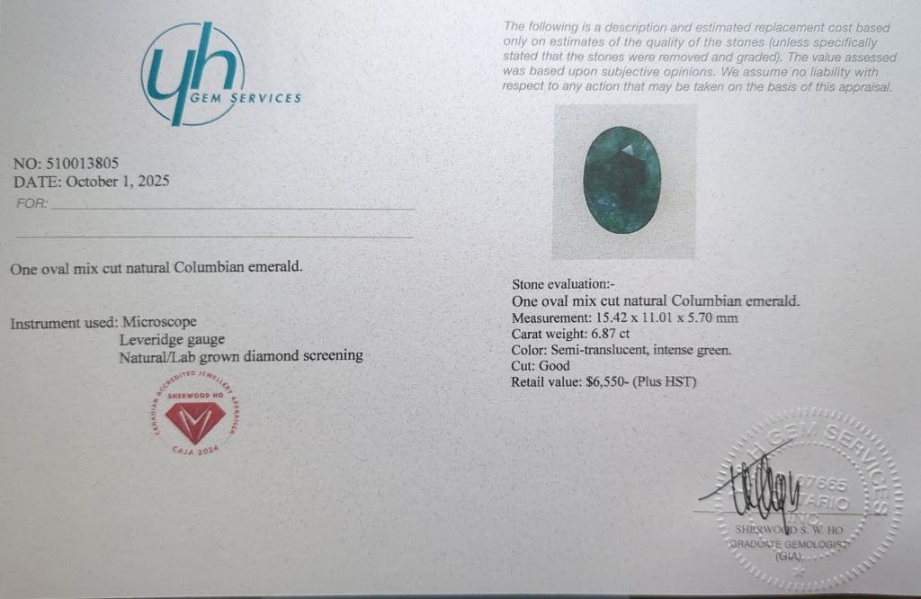 6.87 CT CERTIFIED EMERALD GEMSTONE ($6,550 APPRAISAL)