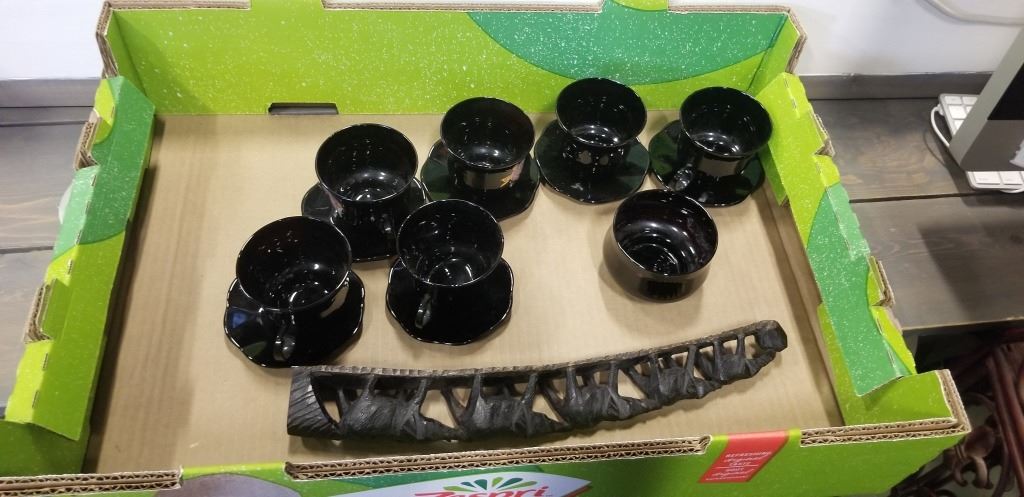 6 BLACK HAND PAINTED CUOPS AND SAUCERS, AND CARVED WOODEN ELEPHANT PIECE