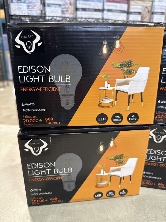 6 BOXES OF NEW EDISON LIGHT BULBS, 6 PER BOX, LED, 600 LUMENS, 20,000 HOURS, NON-DIMMABLE
