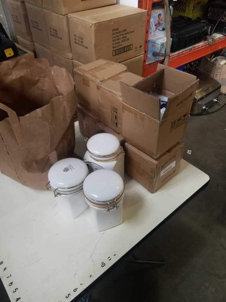6 BUTTER JARS AND 3 PC PORCELAIN CANNISTER SET